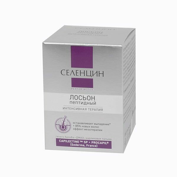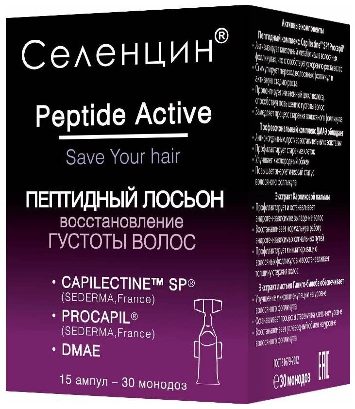 Специализированный лосьон для восстановления густоты волос Селенцин Peptide Active «Save Your hair» основан на комплексе пептидов: Capilectine™ SP и PROCAPIL®, который известен в профессиональной косметологии компонента ДМАЭ и биоактивных компонентов экстрактов Карликовой пальмы и листьев Гинкго билобы, специально создан для предотвращения чрезмерного выпадения, активного роста и восстановления густоты волос. Показан при поредении и истончении волос, при андрогенном выпадении волос, при длительном диффузном выпадении волос.Пептидный лосьон для восстановления густоты волос Селенцин Peptide Active «Save Your hair» -Замедляет старение волосяного фолликула на 41%*,-Стимулирует рост волос эффективнее на 63 %*, чем стандартная терапия,-Восстанавливает густоту волос без синдрома отмены и без инъекций.**По данным лаборатории SEDERMA, FranceКурс применения составляет не менее 4-х месяцев.Для достижения максимального эффекта рекомендуется использовать совместно с лекарственным средством Селенцин, возможно дополнительное использование со специализированным шампунем, бальзамом-ополаскивателем и маской от выпадения волос «Hair Therapy» косметической линии «СЕЛЕНЦИН».