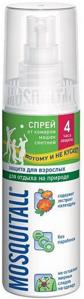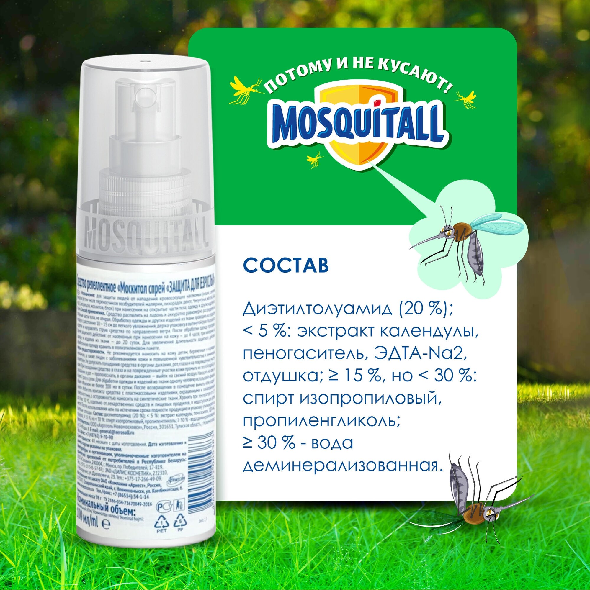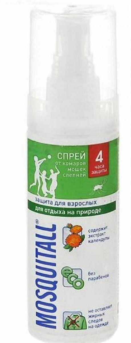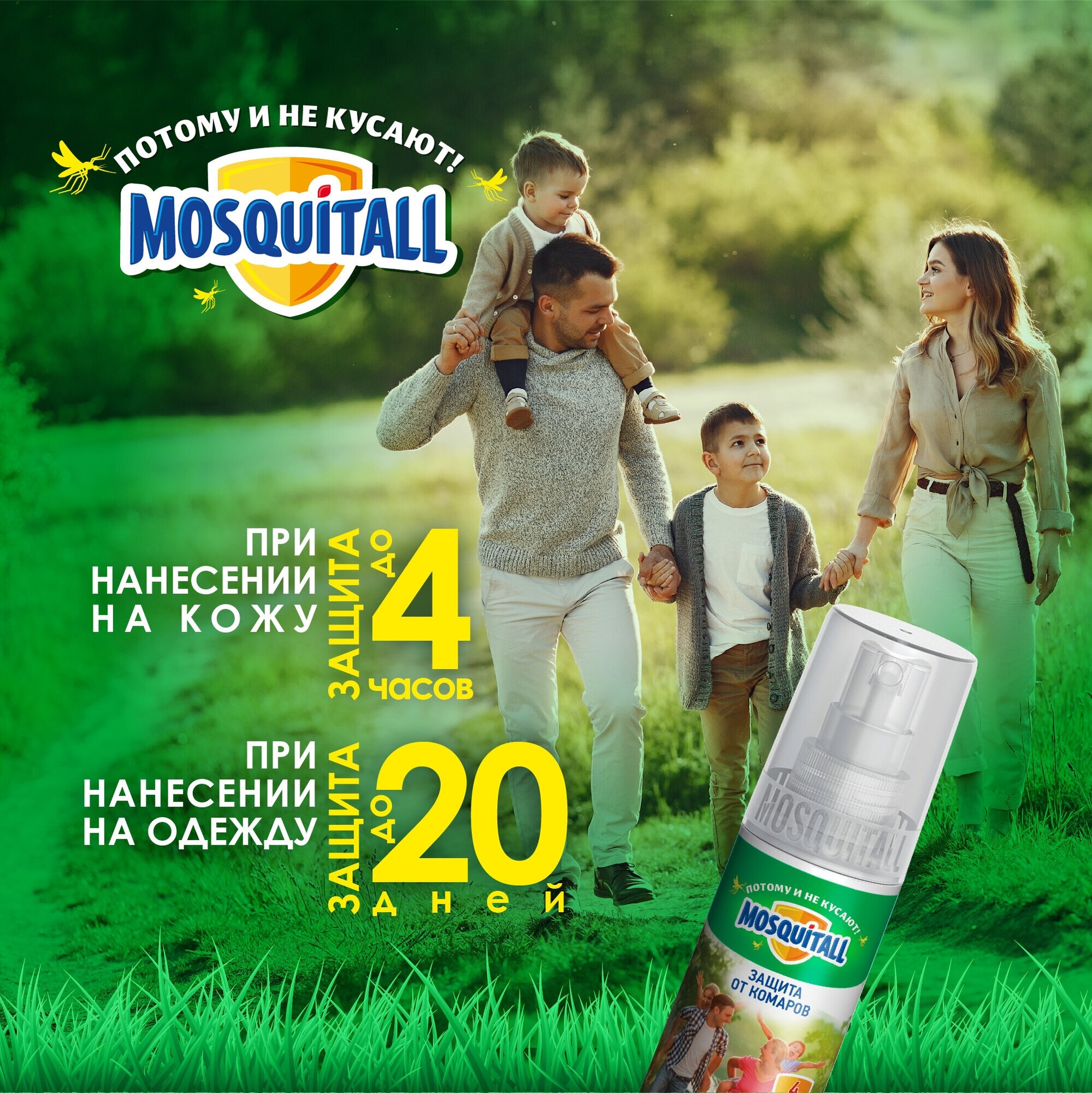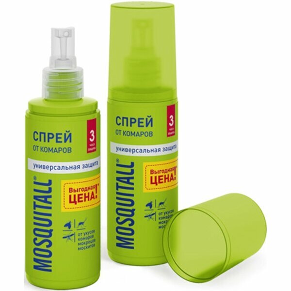 Спрей Mosquitall "Универсальная защита" предназначен для нанесения на открытые участки тела и одежду. Он эффективно защищает от укусов комаров, мокрецов, москитов. Благодаря удобному распылителю, спрей быстро и легко наносится и отпугивает комаров и других кровососущих насекомых. Не оставляет жирных следов на одежде. Время действия - до 3 часов. Средство подходит для всей семьи, разрешено к применению детям от 5 лет.