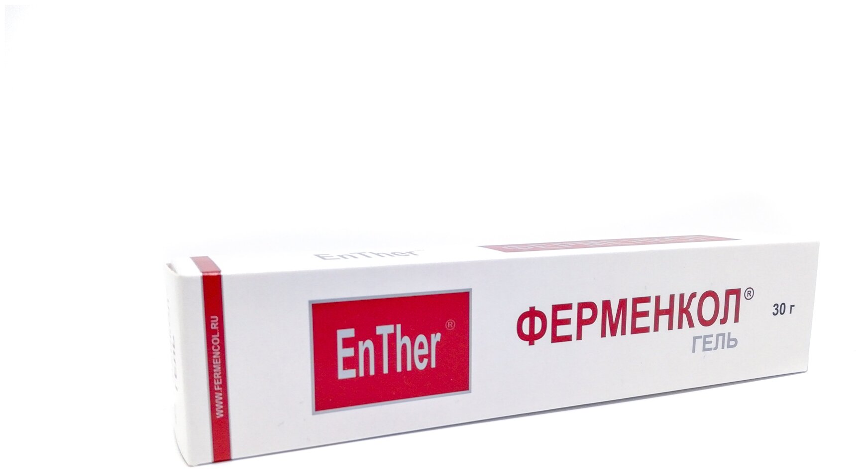 ENTHER ФЕРМЕНКОЛ ГЕЛЬ КОСМЕТИЧЕСКИЙ - ферментное средство из коллагеназ гидробионтов, представляющее собой комплекс коллагенолитических протеаз с моле-кулярными массами 36 кДа, 35 (I) кДа, 35 (II) кДа, 32 кДа, 28 кДа, 25 (I) кДа, 25 (II) кДа, 25 (III) кДа и 23 кДа.Внешний вид и свойства: прозрачная массаДЕЙСТВИЕ:Комплекс коллагенолитических протеаз из гидробионтов обладает высокой коллагенолитической активностью, обеспечивая гидролиз пептидных связей коллагена.Проявляет избирательную активность к молекулам измененного коллагена и наименее активен в отношении фибрилл нативного коллагена, присущего здоровой коже.Коррекция и улучшение внешнего вида проблемной рубцово-измененной кожи происходит вследствие гидролиза избыточного коллагена.Помимо коллагенолитической комплекс коллагенолитических протеаз из гидробионтов обладает общей протеолитической активностью и способностью гидролизовать полисахариды, благодаря чему происходит комплексное воздействие на проблемную рубцово-измененную кожу.Средства Ферменкол® косметической линии EnTher® способствуют: