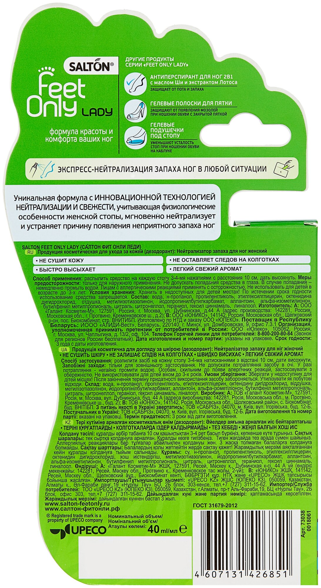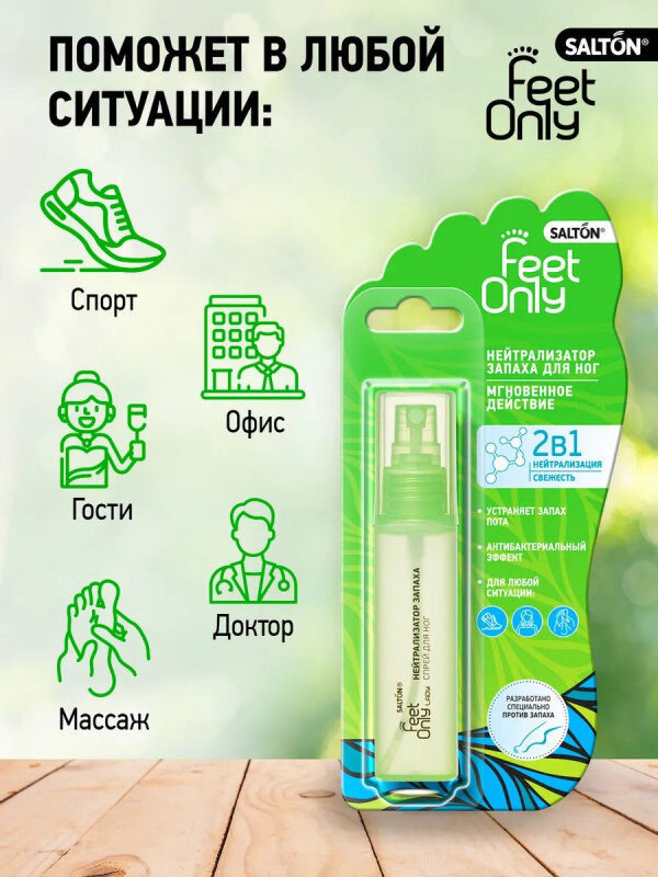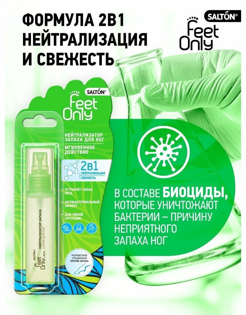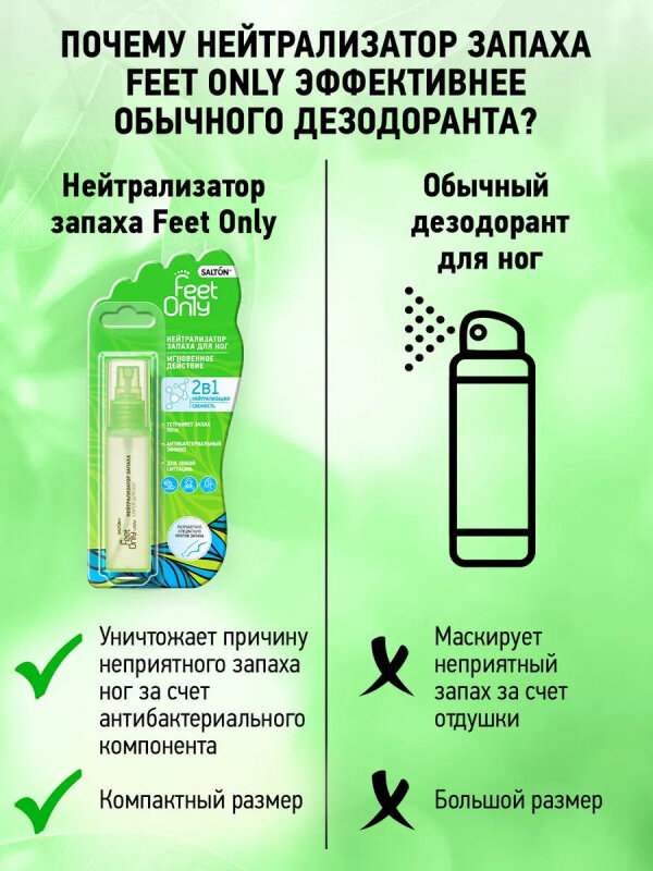 В отличие от обычного дезодоранта для ног, Salton Feet Only мгновенно нейтрализует запах и устраняет бактерии, которые являются основной причиной неприятного запаха, а также придает коже легкий свежий аромат.