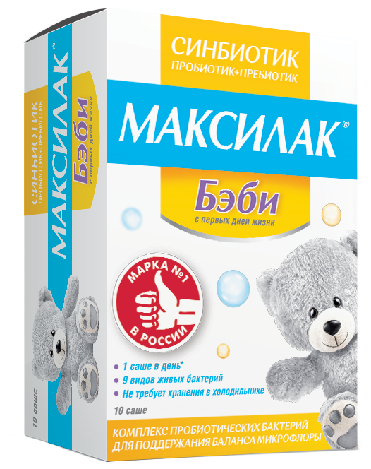 Показания В качестве источника пробиотических микроорганизмов (бифидобактерии, лактобактерии): при функциональных расстройствах кишечника (диарее, диспепсии, запоре, метеоризме, тошноте, отрыжке, рвоте/дискомфорте и болях в животе); для нормализации микрофлоры кишечника в процессе и/или после приема препаратов, которые могут вызвать изменения качественного или количественного состава микрофлоры ЖКТ; для поддержания иммунитета в период сезонных всплесков инфекционных заболеваний; для профилактики кишечных расстройств при смене климата, места пребывания. Фармакологическое действие Максилак® Бэби - первый синбиотик, зарегистрированный в РФ, который содержит 9 культур полезных бактерий в необходимой для кишечника ребенка концентрации - 1 миллиард (1×109) КОЕ. Содержащиеся в составе синбиотика Максилак® Бэби лактобактерии подавляют рост патогенной микрофлоры, обеспечивают защитную функцию организма и естественным путем укрепляют иммунитет. Бифидобактерии, которые также входят в состав синбиотика Максилак® Бэби, участвуют в синтезе аминокислот, белков и витаминов, усиливают всасывание ионов кальция, железа, витамина D. Фруктоолигосахариды (пребиотик в составе синбиотика Максилак® Бэби) стимулируют быстрое размножение полезных микроорганизмов, что тормозит развитие болезнетворных бактерий, уменьшают загрязнение кишечника токсинами и улучшают его работу, стимулируют перистальтику, очищают от шлаков, служат в целях профилактики запоров и диареи, способствуют нормализации функций ЖКТ. Максилак® Бэби - синбиотик, специально созданный для детей и выпускаемый с помощью инновационной технологии производства. Данная технология защищает гранулы Максилак® Бэби от действия факторов внутренней и внешней среды, благодаря чему большая часть пробиотических бактерий в составе синбиотика Максилак® Бэби попадает в кишечник, а не растворяется в желудке, что положительно сказывается на восстановлении микрофлоры ЖКТ, т.к. концентрация колоний микроорганизмов возрастает от желудка к толстой кишке. Максилак® Бэби не содержит казеина и консервантов, поэтому безопасен для детей с аллергией на продукты этой группы. Максилак® Бэби можно применять у детей с непереносимостью лактозы.