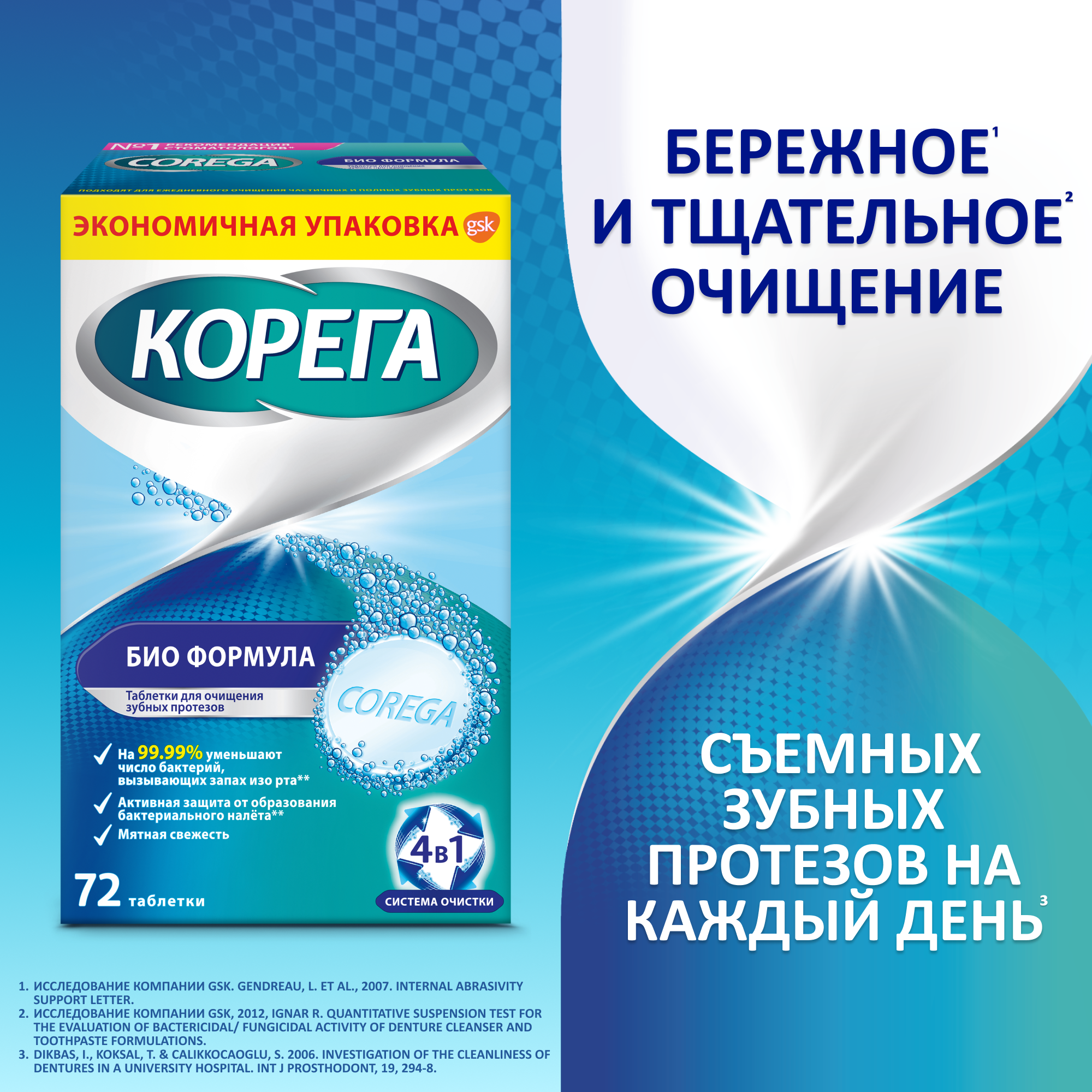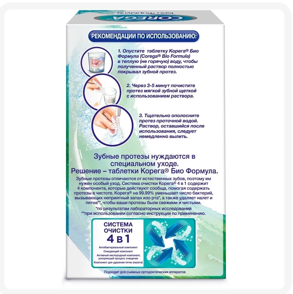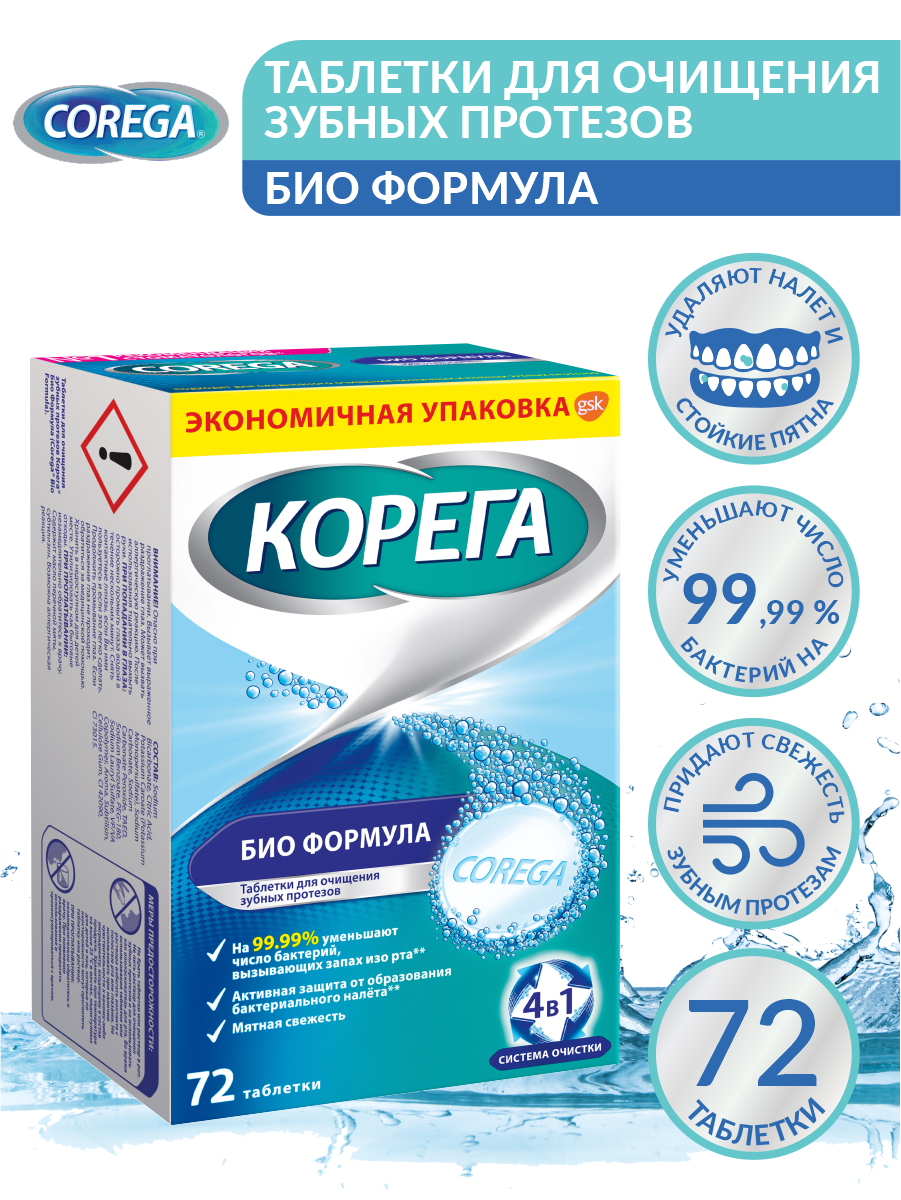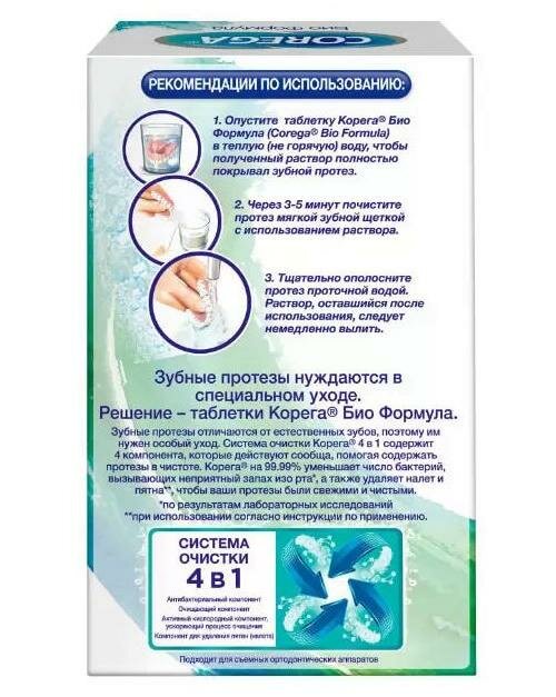 Таблетки для очищения зубных протезов Корега Био Формула обеспечивают бережное и эффективное очищение зубных протезов. Основные преимущества: - Глубокое очищение даже в труднодоступных местах - На 99,9% уменьшают число бактерий, вызывающих неприятный запах изо рта.* - Не царапают зубной протез при очищении** *при замачивании, по результатам лабораторных исследований. Оценка антимикробной эффективности средства для чистки зубных протезов. Обзор компании ГСК, 2012 **Обоснование свойств по отсутствию абразивных частиц в составе средств для очистки зубных протезов Корега. Обзор компании ГСК, 2007