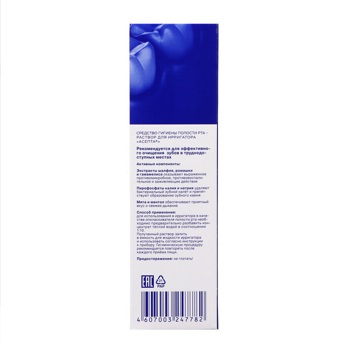 Концентрированный раствор для ирригатора Асепта эффективен для удаления налета из труднодоступных мест, профилактики кариеса и зубного камня, уменьшения симптомов воспаления десен.
