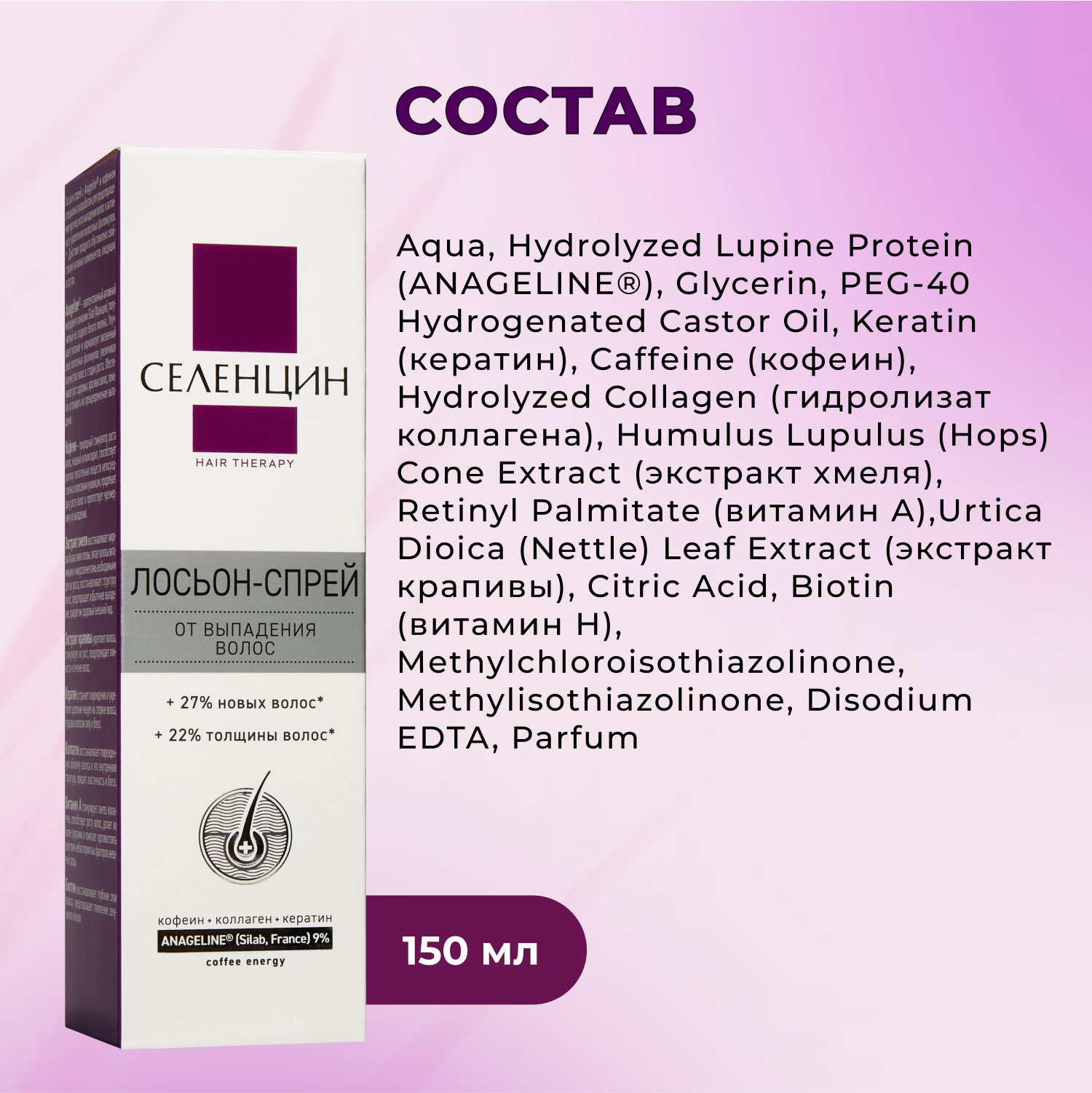 В комплексе результат на отлично, волосы перестали выпадать. Лосьон брызгала на корни, чуть боле месяца, пока флакон не закончился. Мыла голову тоже Селенцином (и до сих пор профилактикой), от выпадения это линия та же, что и спрей этот, Хаир Терапия. И курс таблеток Селенцин от диффузной алопеции. Чисто один спрей не могу утверждать что помогает, а вот комплекс очень даже эффективно.