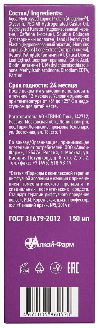 ПОКАЗАНИЕ: предотвращение чрезмерной потери волос, восстановление структуры поврежденных волос.ДЕЙСТВИЕ: оказывает выраженное укрепляющее действие на волосяные луковицы за счет повышенной концентрации активных ингредиентов, останавливает чрезмерную потерю волос, увлажняет кожу головы, возвращает естественный блеск и шелковистость, придает дополнительный объем волосам.