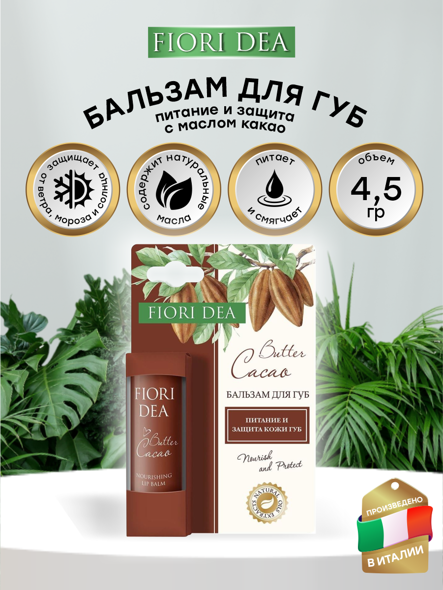 Бальзам для губ FIORI DEA Масло какао питательный 4,5 гр идеально подойдет тем, кто хочет сохранить мягкость и увлажненность кожи губ. Масло какао необыкновенно полезно для кожи, оно глубоко питает, смягчает и восстанавливает. Эффективно защищает нежную кожу губ от ветра, мороза и солнца.