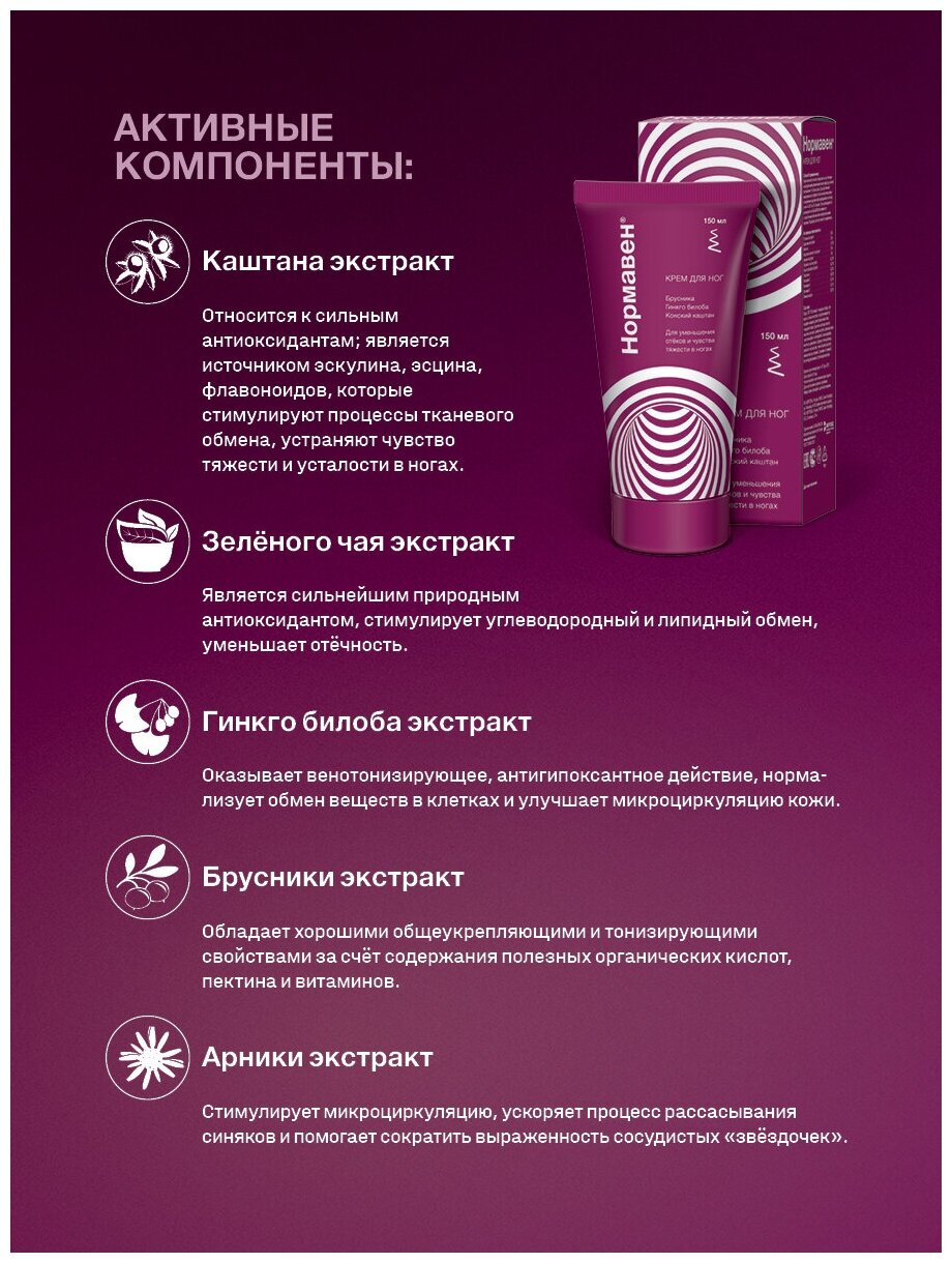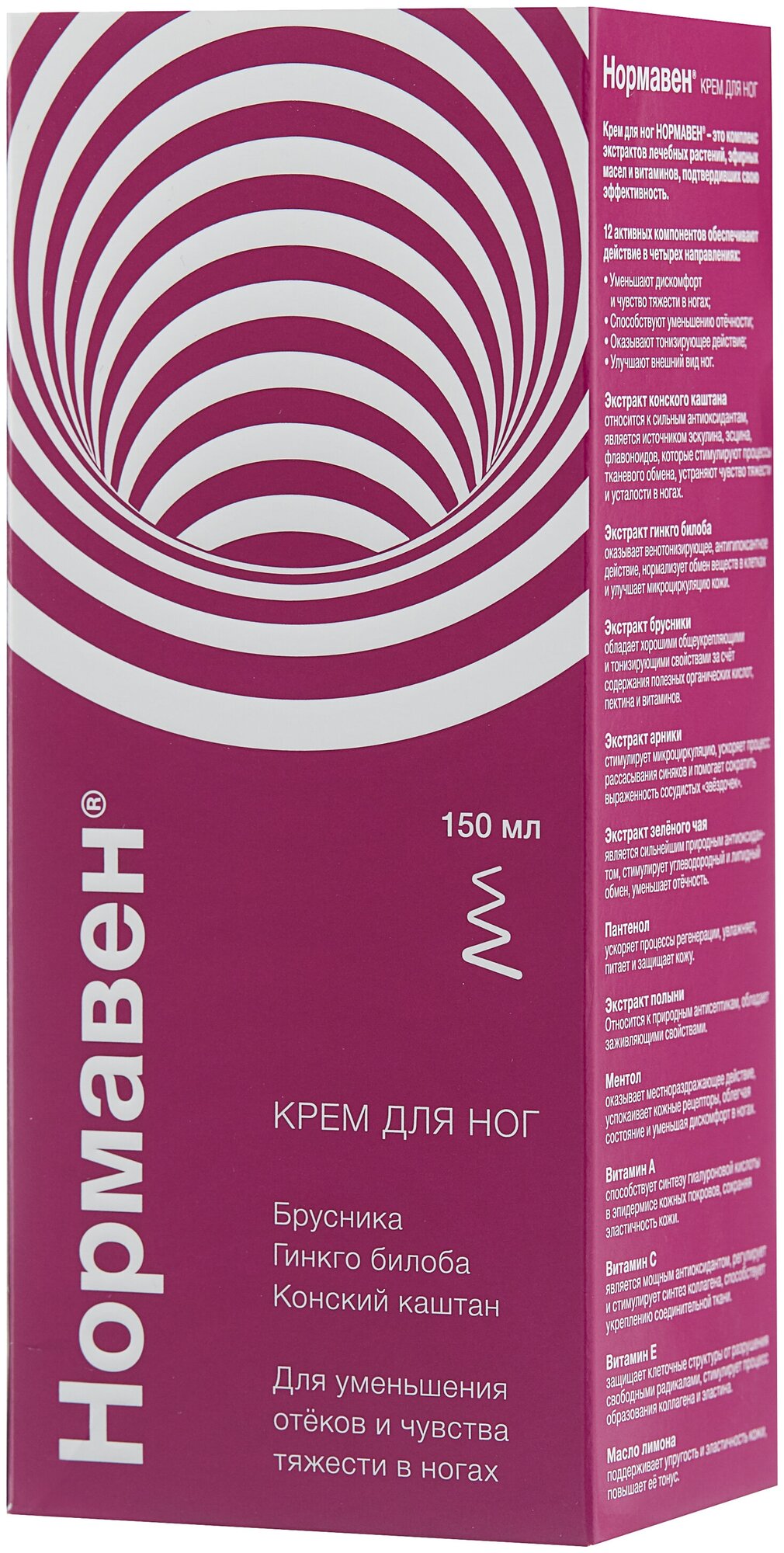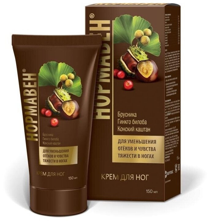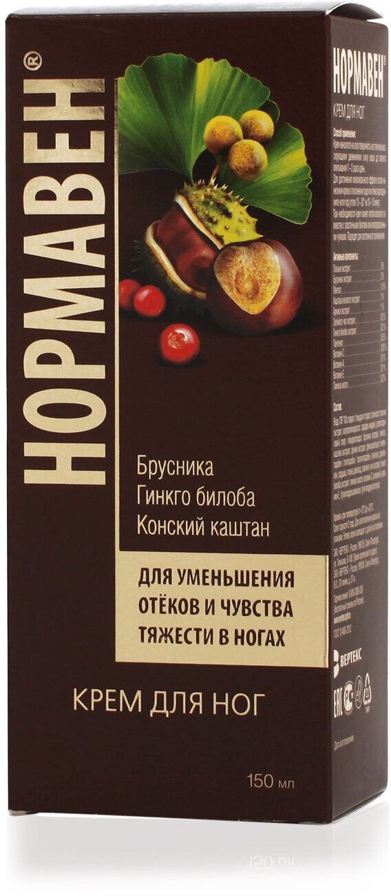 НОРМАВЕН крем для ног состоит из тщательно подобранных активных компонентов натурального происхождения, которые снимают чувство усталости и тяжести в ногах, уменьшают отёчность, помогают переносить длительные статические нагрузки на ноги, способствуют исчезновению ночных судорог и дарят ногам ощущение комфорта. Можно использовать в период беременности.Венотонизирующее средство12 активных компонентов способствуют:Снятию усталости и чувства тяжести в ногах:Устранению и предотвращению отеков:Уменьшению сосудистого «рисунок»:Укреплению стенок кровеносных сосудов:Увеличению сопротивляемости капилляров и поддержанию оптимального тонуса сосудистой стенки:Улучшению внешнего вида кожи.Активные компоненты:Экстракт полыни 5%Экстракт брусники..2%Ментол-.1,5%Экстракт конского каштана1%Экстракт арники..1%Пантенол-..0,5%Экстракт зелёного чая.0,3%Экстракт гинкго билоба.0,2%Масло лимона-..0,2%Витамин С-0,15%Витамин А-0,1%Витамин Е-.0,1%Активные компоненты. Компонент - Эффект. Каштана экстракт Относится к сильным антиоксидантам: является источником эскулина, эсцина, флавоноидов, которые стимулируют процессы тканевого обмена, устраняют чувство тяжести и усталости в ногах.Зеленого чая экстракт Является сильнейшим природным антиоксидантом, стимулирует углеводородный и липидный обмен, уменьшает отёчность.Гинкго билоба экстракт Оказывает венотонизирующее, антигипоксантное действие, нормализует обмен веществ в клетках и улучшает микроциркуляцию кожи.Брусники экстракт Обладает хорошими общеукрепляющими и тонизирующими свойствами за счёт содержания полезных органических кислот, пектина и витаминов.Арники экстракт Стимулирует микроциркуляцию, ускоряет процесс рассасывания синяков и помогает сократить выраженность сосудистых «звездочек».Пантенол Ускоряет процессы регенерации, увлажняет, питает и защищает кожу.Полыни экстракт Относится к природным антисептикам, обладает заживляющими свойствами.Ментол Оказывает местнораздражающее действие, успокаивает кожные рецепторы, облегчая состояние и уменьшая дискомфорт в ногах.Витамин А Способствует синтезу гиалуроновой кислоты в эпидермисе кожных покровов, сохраняя эластичность кожи.Витамин С Является мощным антиоксидантом, регулирует и стимулирует синтез коллагена, способствует укреплению соединительной ткани.Витамин Е Защищает клеточные структуры от разрушения свободными радикалами, стимулирует процесс образования коллагена и эластина.Лимона масло Поддерживает упругость и эластичность кожи, повышает её тонус.Серия средств НОРМАВЕН разработана специалистами фармацевтической компании «ВЕРТЕКС» на основе специально подобранных растительных экстрактов, эфирных масел и витаминов, оказывающих выраженное противоотёчное и тонизирующее действие.Все активные компоненты средств НОРМАВЕН получены путем высокотехнологичной обработки лекарственных растений.Средства НОРМАВЕН дарят ногам ощущение легкости и комфорта даже после тяжелого дня.