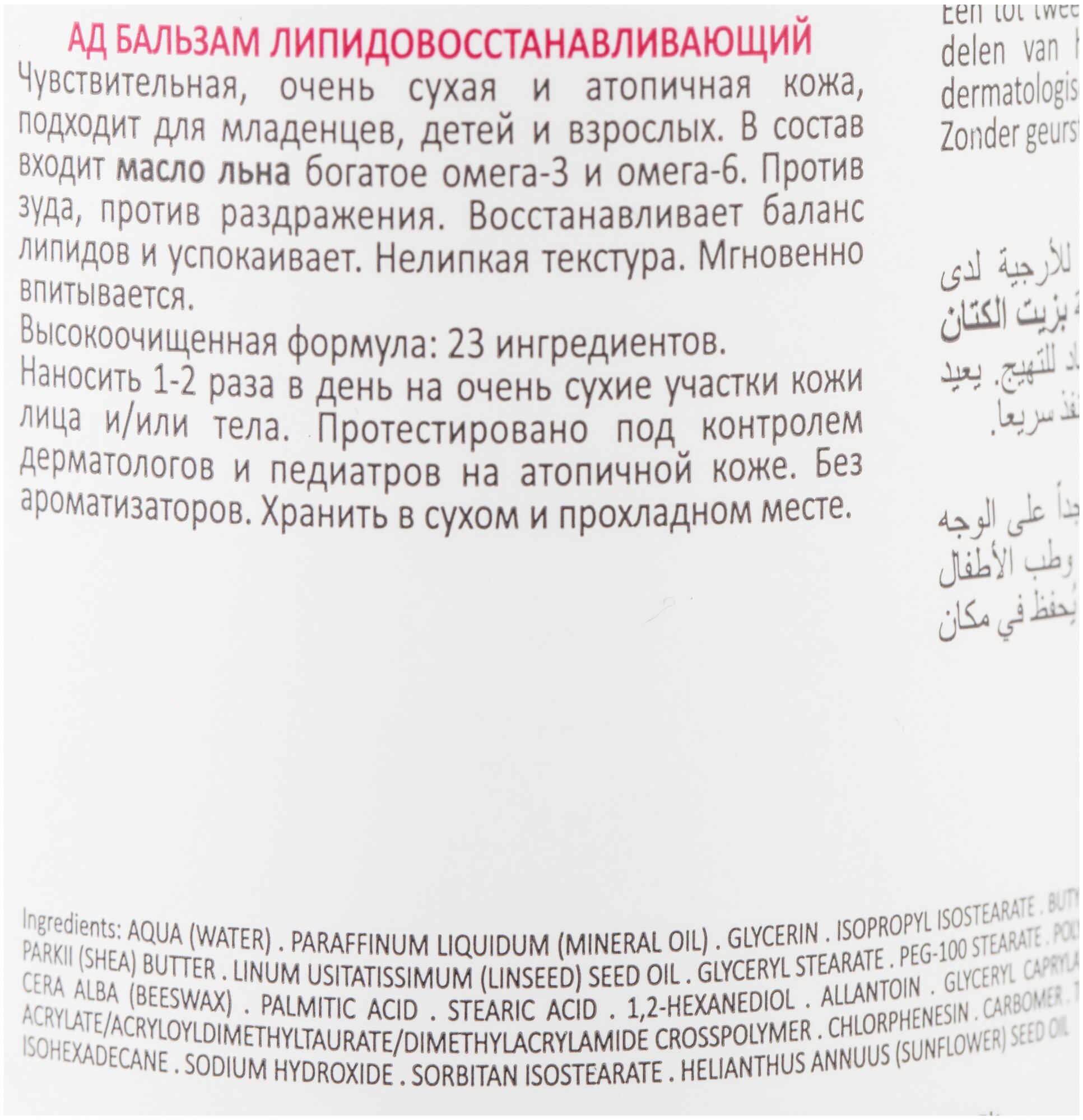 Разработан для ухода за очень сухой чувствительной и атопичной кожей младенцев, детей и взрослых. Восстанавливает гидролипидную пленку, успокаивает, увлажняет и смягчает кожу. Содержит льняное масло (насыщает необходимыми жирными кислотами омега 3 и 6, восстанавливает гидролипидную плёнку) и аллантоин (уменьшает раздражения, зуд, ощущение покалываний). Нежирная и нелипкая текстура. Быстро впитывается.