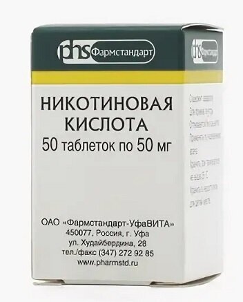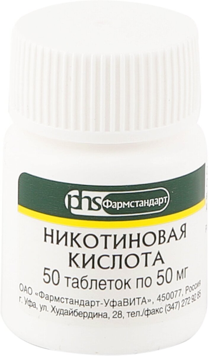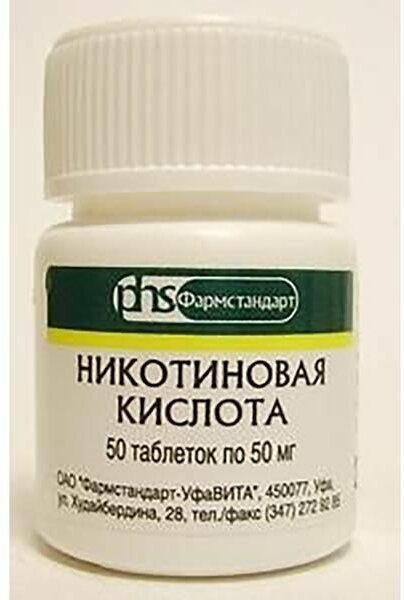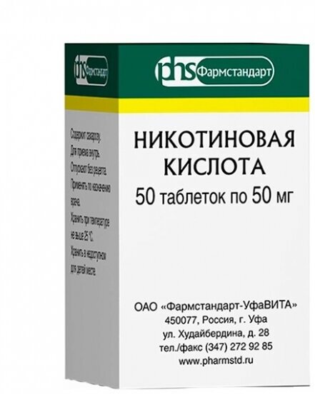 | Рекомендациипо приему (дозировка) | таблетки никотиновой кислоты принимают внутрь после еды. Как антипеллагрическое средство никотиновую кислоту назначают взрослым по 0, 1 г (2 таблетки) 2–4 раза в сутки (высшая суточная доза 0, 5 г). Детям назначают, начиная с 3-х лет, по 0, 05 г 2–3 раза в день в зависимости от возраста. Курс лечения 15–20 дней. Взрослым при ишемических нарушениях мозгового кровообращения, спазмах сосудов конечностей, гастритах с пониженной кислотностью, неврите лицевого нерва, ранах и язвах никотиновую кислоту рекомендуют в разовой дозе 0, 05–0, 1 г, в суточной дозе — до 0, 5 г. Курс лечения — 1 месяц. Повторные курсы — по рекомендации врача |