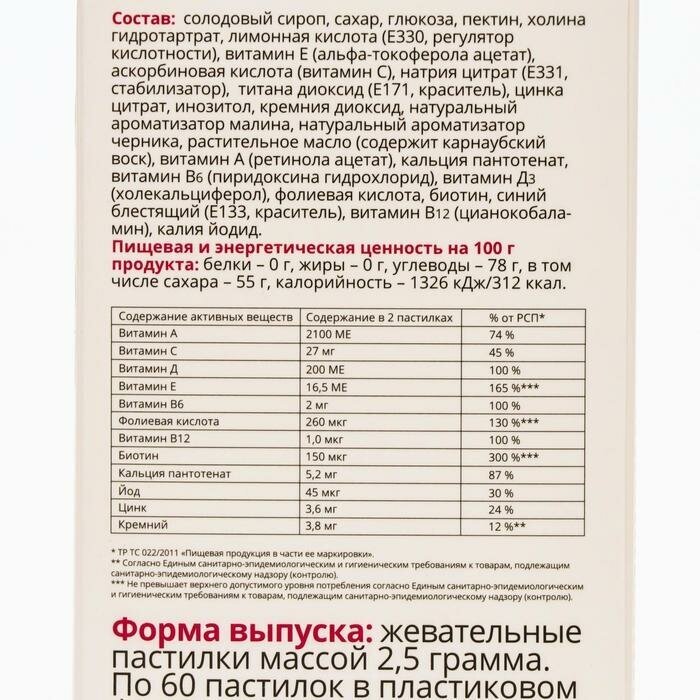 | Состав | солодовый сироп, сахар, глюкоза, пектин, холина гидротартрат, лимонная кислота (е330, регулятор кислотности), витамин E (альфа-токоферола ацетат), аскорбиновая кислота (витамин C), натрия цитрат (е331, стабилизатор), титана диоксид (е171, краситель), цинка цитрат, инозитол, кремния диоксид, натуральный ароматизатор малина, натуральный ароматизатор черника, растительное масло (содержит карнаубский воск), витамин A (ретинола ацетат), кальция пантотенат, витамин B6 (пиридоксина гидрохлорид), витамин D3 (холекальциферол), фолиевая кислота, биотин, синий блестящий (е133, краситель), витамин B12 (цианокобаламин), калия йодид |