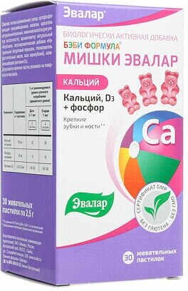 Большинство специалистов рекомендуют заботиться о здоровье зубов, красоте улыбки и крепости костей с самого детства. Сложно переоценить роль кальция в этом вопросе. Чтобы снизить риск возникновения кариеса, в первую очередь необходимо обратить внимание на питание ребенка: достаточно ли кальция в его рационе, и при необходимости выбрать ребенку кальцийсодержащий комплекс, разработанный специально для детей, с учетом возрастных особенностей и потребностей детского организма в кальции и витамине D3. В этом случае идеально подойдет Бэби Формула Мишки Кальций. Это уникальный1 комплекс, разработанный специально для детей и содержащий сбалансированные профилактические дозировки кальция, витамина D и фосфора. Действуя вместе, компоненты комплекса Бэби Формула Мишки Кальций способствуют: Снижению риска развития кариеса Укреплению зубов и костей Формированию правильной осанки Преимущества: done Приятный ягодный вкус done Без искусственных красителей, ароматизаторов и консервантов done Без глютена и ГМО done Высокое качество гарантировано международным стандартом качества GMP2. Как работают ингредиенты Кальций является главным составляющим компонентом костей и зубов. Он играет важнейшую роль для роста детей. Но кальций не способен усвоиться без помощи витамина D3. Витамин D3 участвует в минеральном обмене, влияя на усвоение кальция, поэтому без такого витамина кости и зубки ребенка будут менее твердыми и более хрупкими, а их развитие нарушится. Нехватка витамина D3 сказывается на росте костей и провоцирует истончение эмали зубов. Также он способствует лучшему усвоению и фосфора. Фосфор обеспечивает сопротивляемость наружного слоя эмали и является наиболее эффективным в детском возрасте, когда эмаль еще не зрелая. Именно от этого элемента во многом зависит красивая белизна зубов и блеск, а также прочность эмали. Без него зубы могут стать ослабленными, тусклыми, более подверженными разрушительному воздействию.