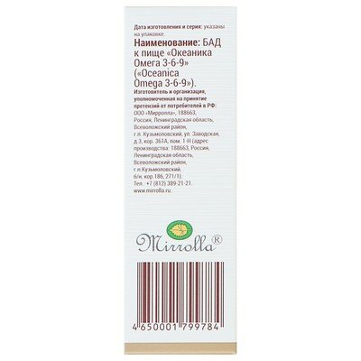 Область применения: в качестве дополнительного источника полиненасыщенных жирных кислот (ПНЖК) Омега-3 (эйкозапентаеновой, докозагексаеновой, альфа-линоленовой кислот), ПНЖК Омега-6 (линолевой и гамма-линоленовой кислот), витамина Е.