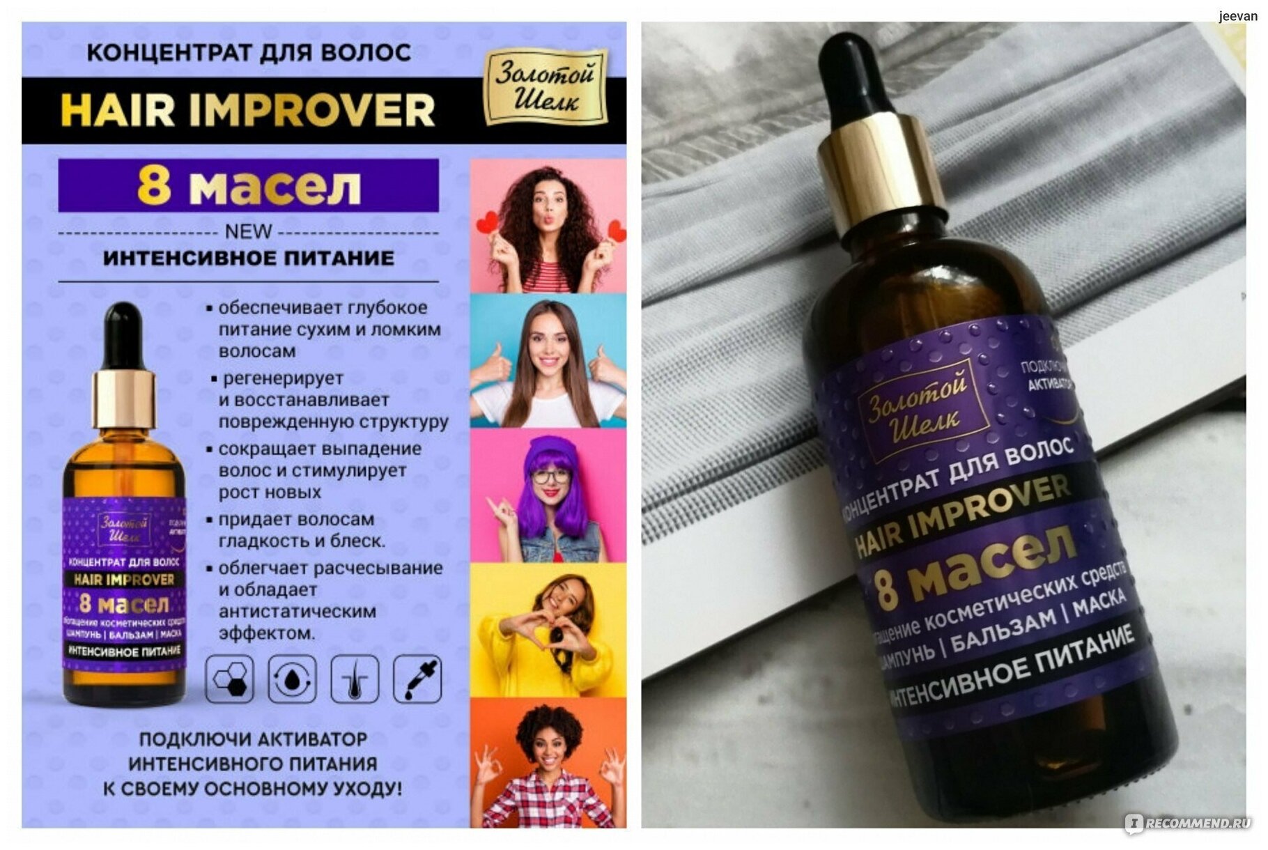 Коллекция концентратов Hair Improver повысит эффективность любого шампуня, бальзама или маски до максимума. Концентрат содержит 8 масел (масла арганы, макадамии, ши, жожоба, монои, кокосовое, репейное и касторовое), которые вместе обеспечивают глубокое питание сухих и ломких волос. Средство восстанавливает поврежденную структуру волоса, сокращает выпадение волос и стимулирует рост новых. После применения волосы гладкие и блестящие, легко расчесываются и не пушатся.