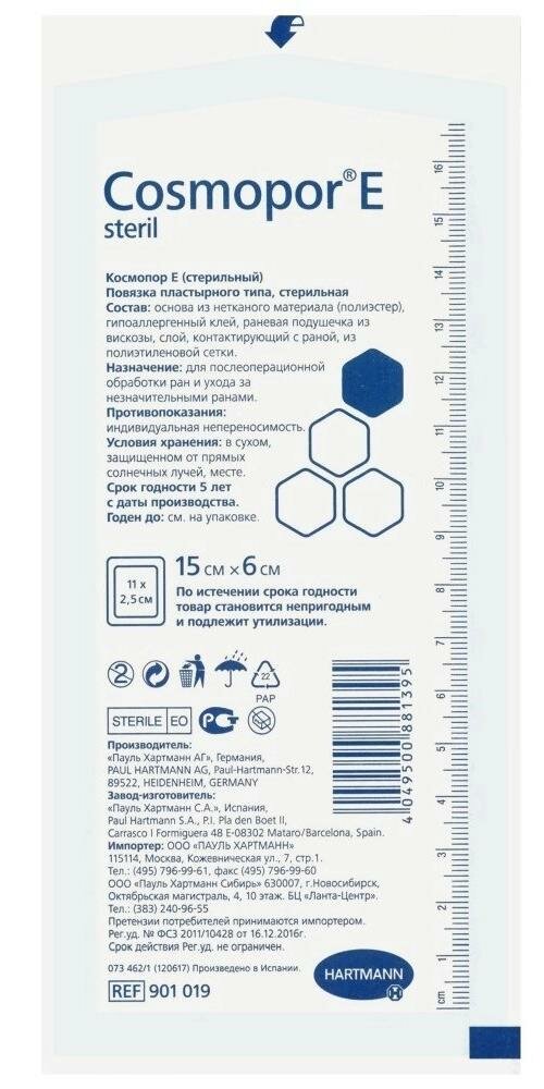 Hartmann COSMOPOR E самоклеящаяся послеоперационная повязка. Назначение: - Для ухода за послеоперационными ранами - Для стерильного ухода при незначительных повреждениях кожи Описание: - Самоклеящаяся послеоперационная повязка из мягкого нетканого материала со специальной впитывающей прокладкой, не прилипающей к ране - Хорошая сорбционная способность и защитные свойства - Гипоаллергенный полиакрилатный клей не раздражает кожу - Повязка безболезненно и без остатков удаляется - Стерильно, запечатано поштучно Форма выпуска:15 х 6 см, 25 шт. Состав Самоклеящаяся стерильная повязка на рану из мягкого нетканого материала с закругленными краями, со специальной не приклеивающейся к ране впитывающейся подушечкой. Состав: основа - нетканый полиэстер; клейкая поверхность - синтетический каучуковый клей без канифоли; впитывающая подушечка - абсорбирующая вискоза; покрытие - полиэтиленовая сетка; защитный слой -обработанная силиконом бумага с отметкой места вскрытия. Ингредиенты Самоклеящаяся стерильная повязка на рану из мягкого нетканого материала с закругленными краями, со специальной не приклеивающейся к ране впитывающейся подушечкой. Состав: основа - нетканый полиэстер; клейкая поверхность - синтетический каучуковый клей без канифоли; впитывающая подушечка - абсорбирующая вискоза; покрытие - полиэтиленовая сетка; защитный слой -обработанная силиконом бумага с отметкой места вскрытия.