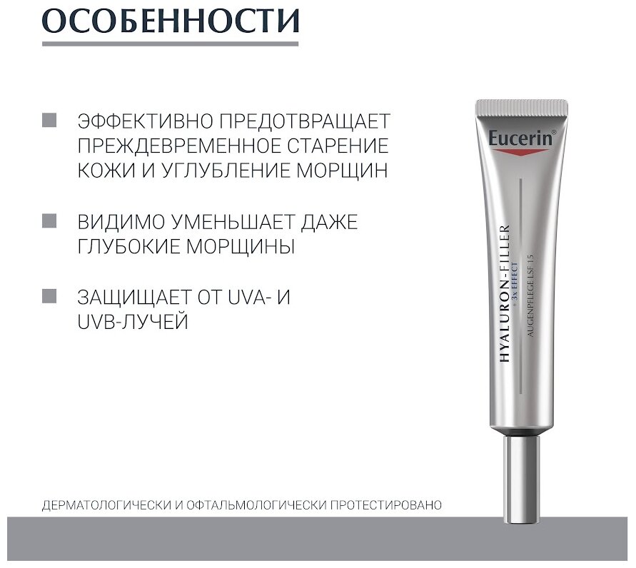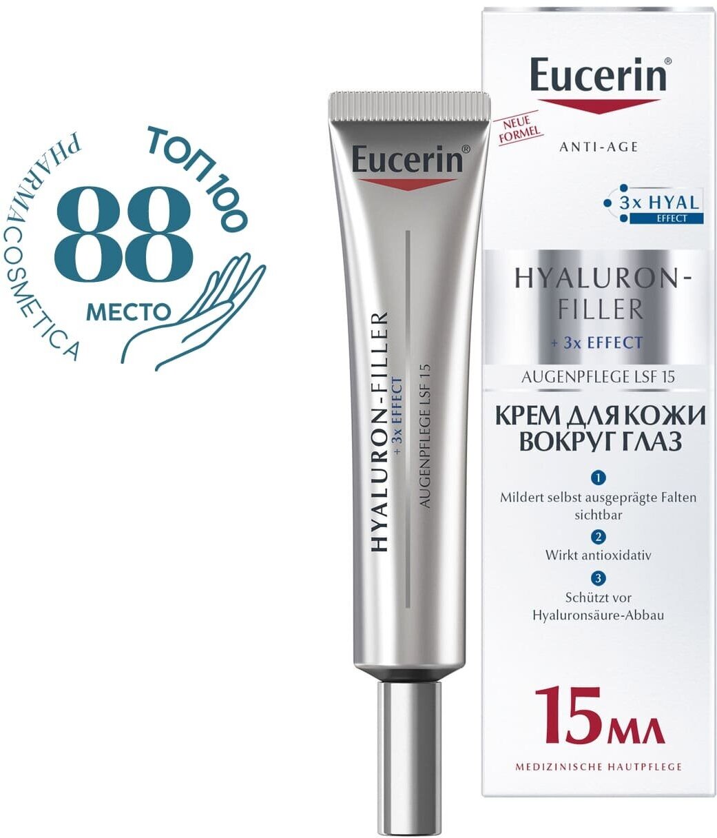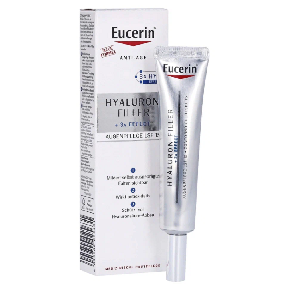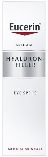 Eucerin Hyaluron-Filler Крем для кожи вокруг глаз эффективно увлажняет и воздействует на признаки старения. Подходит для взрослых. Разглаживает поверхностные морщинки Заметно уменьшает даже самые глубокие морщины Придаёт коже свежий вид Защищает от воздействия солнечных лучей (SPF 15) Средство Hyaluron-Filler обладает кремообразной текстурой белого цвета, которая является прекрасной основой под макияж. Подходит для людей, использующих контактные линзы. Без отдушки. Офтальмологически протестировано.
