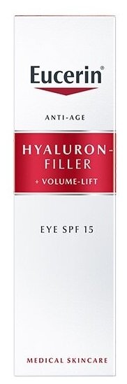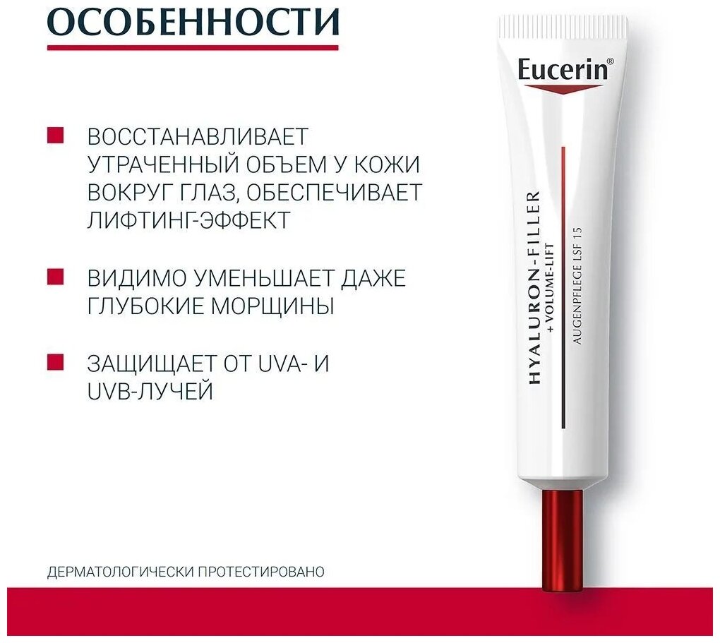 Со временем кожа теряет объем и упругость: контуры лица становятся менее четкими, а черты лица заметно меняются. Крем для ухода за кожей вокруг глаз Eucerin Hyaluron-Filler + Volume-Lift с SPF 15+UVA был специально разработан для устранения глубоких морщин и упругой кожи в деликатной области глаз, защищая все типы кожи от солнца. Крем для кожи вокруг глаз сочетает в себе три активных ингредиента, действие которых направлено на определенные слои кожи, где происходит потеря объема: магнолол увеличивает размер и количество создающих объем клеток1, олигопептиды стимулируют коллагеновую сеть для придания структуре кожи дополнительной упругости(1), а гиалуроновая кислота интенсивно увлажняет кожу и разглаживает глубокие морщины. Регулярное использование крема для ухода за кожей вокруг глаз Eucerin Hyaluron-Filler + Volume-Lift с SPF 15+UVA помогает восстановить потерянный объем и делает кожу вокруг глаз более упругой, обеспечивая лифтинг-эффект. Количество тонких линий и глубоких морщин заметно уменьшается. Благодаря SPF 15 с защитой от UVA, одобренный офтальмологами омолаживающий крем помогает предотвратить фотостарение (преждевременное старение кожи под воздействием солнца) и углубление морщин. (1) Лабораторные исследования Клинические исследования Клинические и дерматологические исследования доказали высокую переносимость и эффективность продукта для чувствительной кожи. Офтальмологически протестировано. Подходит при использовании контактных линз.