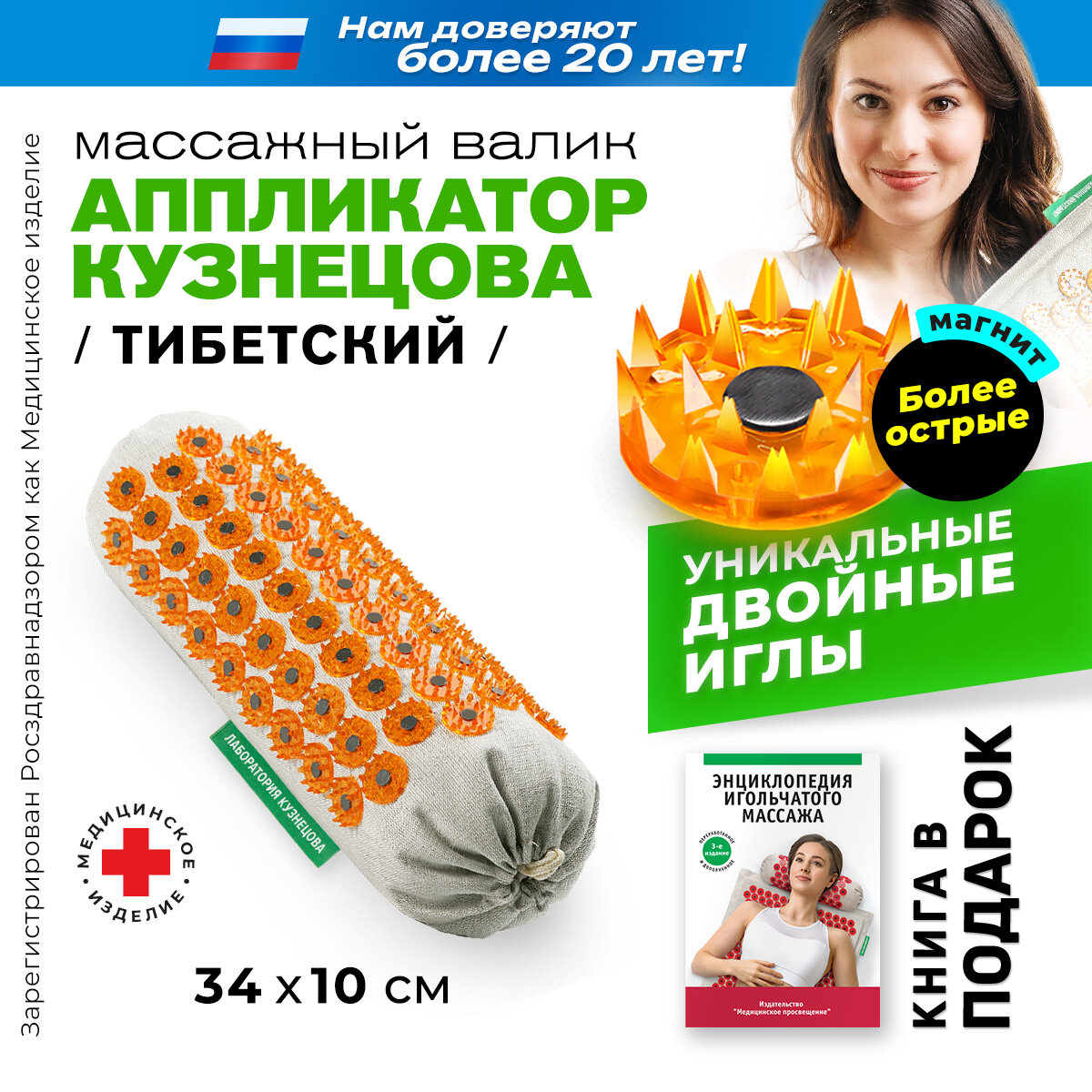 Медицинский массажер "Тибетский аппликатор" с иголками и магнитами для шеи и поясницы. Акупунктурный игольчатый валик эффективно воздействует на различные части тела, снимает боль (в том числе головную) и потерю подвижности. Аппликатор Кузнецова оказывает профилактическое действие, подходит для оздоровления и релаксации, нормализации сна, повышения тонуса и работоспособности, также используется после физических нагрузок. Поддержка и восстановление поврежденных участков тела происходит за счет желтых колющих элементов, имеющих более острые иголочки. Двойное острие препятствует глубокому проникновению игл в кожу, делая процедуру более комфортной и расслабляющей. Пластиковые колючки прочно закреплены на ткани. Массажная подушка имеет специальные магнитные вставки, которые усиливают лечебный эффект. Универсальный валик для массажа можно использовать под разные зоны: под шею, спину (поясницу и позвоночник), ноги (икры и стоп), руки (кисти и пальцы) и др. Колючий аппликатор с шипами выполнен из экологической и долговечной ткани: лён + хлопок. Имеет съемный чехол и наполнитель - синтепух.
