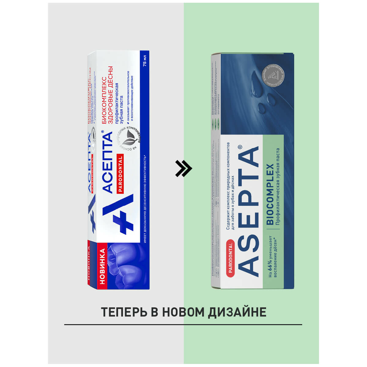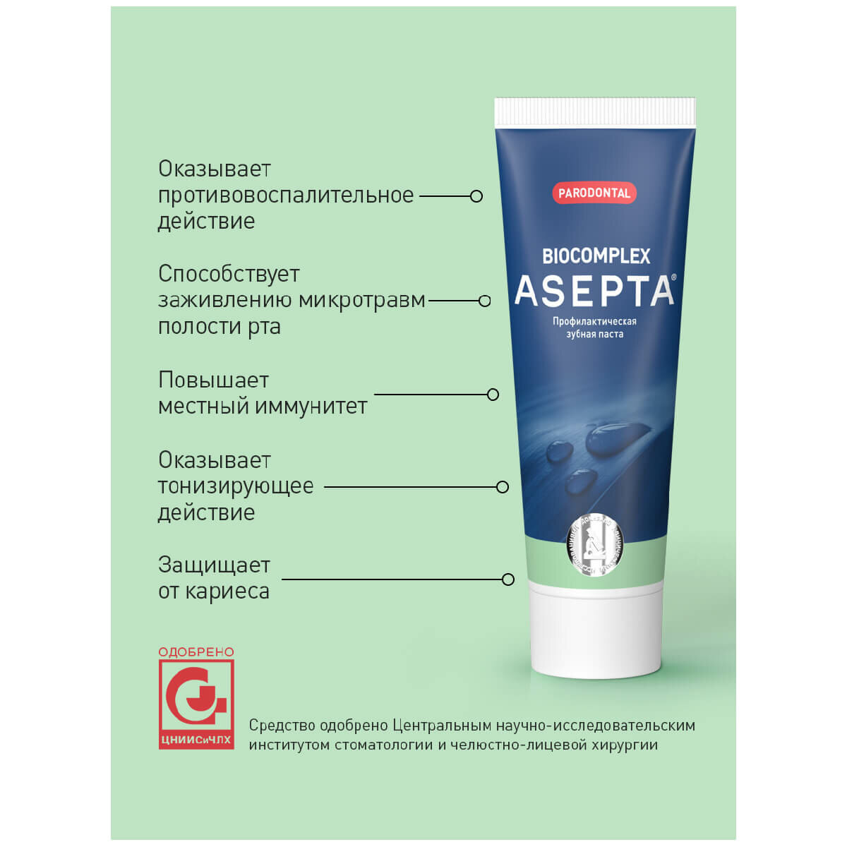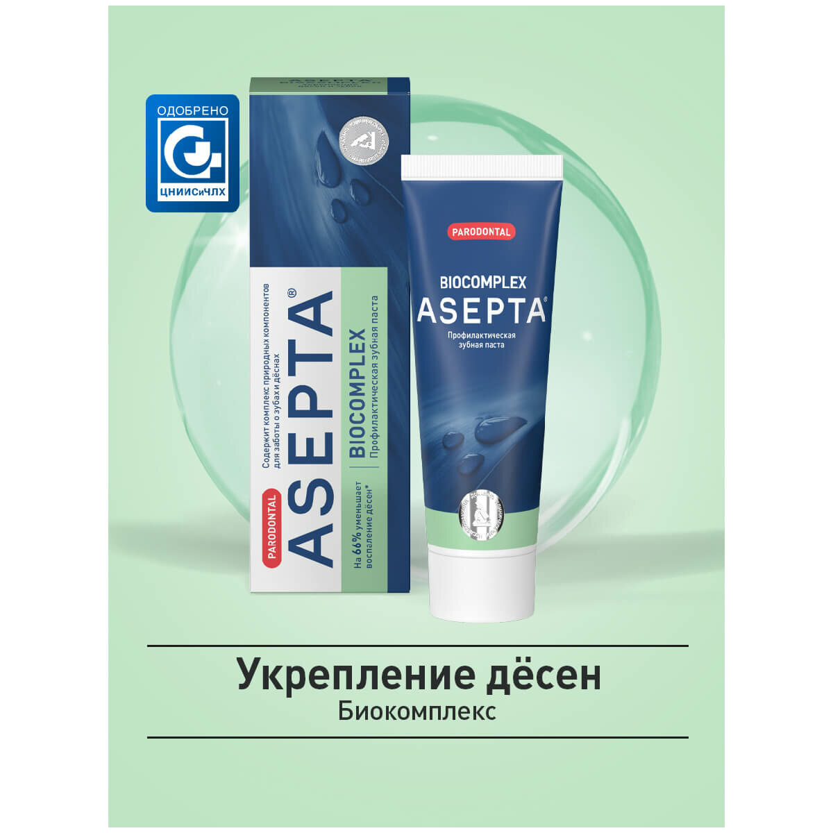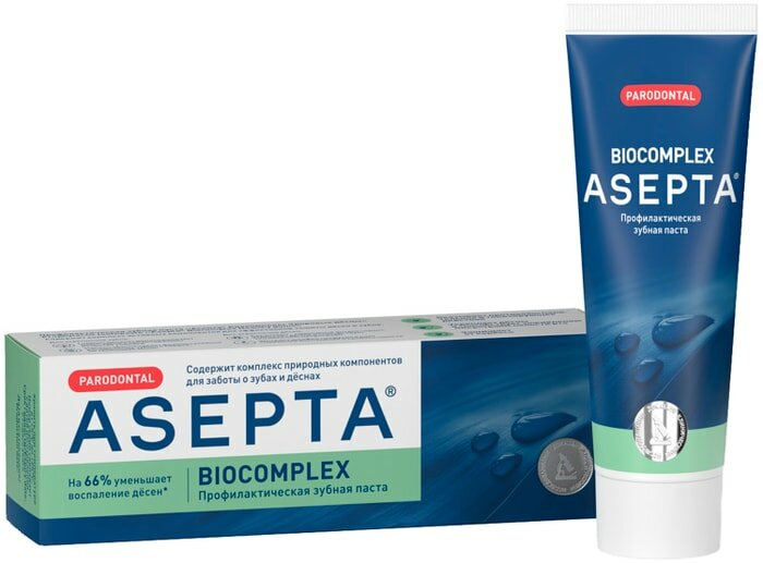 Зубная паста Асепта БИОКОМПЛЕКС Здоровые дёсны предназначена для профилактики воспалений и кровоточивости дёсен, гингивита, от афт. Применяется как во время лечения, так и в профилактических целях.