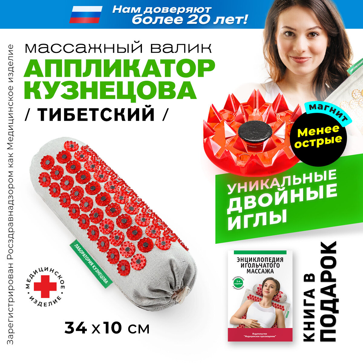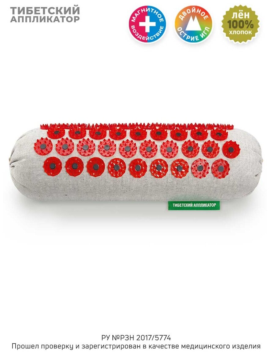 Медицинский массажер "Тибетский аппликатор" с иголками и магнитами для шеи и поясницы. Акупунктурный игольчатый валик эффективно воздействует на различные части тела, снимает боль (в том числе головную) и потерю подвижности. Аппликатор Кузнецова оказывает профилактическое действие, подходит для оздоровления и релаксации, нормализации сна, повышения тонуса и работоспособности, также используется после физических нагрузок. Поддержка и восстановление поврежденных участков тела происходит за счет красных колющих элементов, имеющих менее острые иголочки. Двойное острие препятствует глубокому проникновению игл в кожу, делая процедуру более комфортной и расслабляющей. Пластиковые колючки прочно закреплены на ткани. Массажная подушка имеет специальные магнитные вставки, которые усиливают лечебный эффект. Универсальный валик для массажа можно использовать под разные зоны: под шею, спину (поясницу и позвоночник), ноги (икры и стоп), руки (кисти и пальцы) и др. Колючий аппликатор с шипами выполнен из экологической и долговечной ткани: лён + хлопок. Имеет съемный чехол и наполнитель - синтепух.