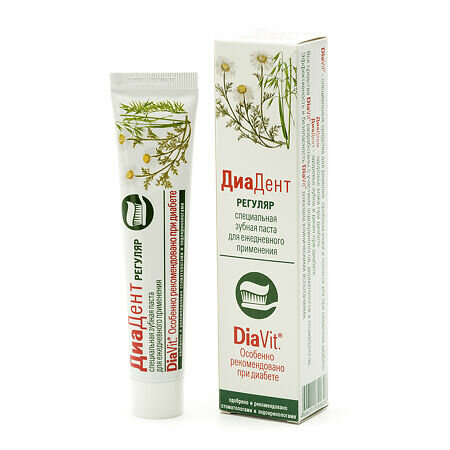 Предназначена для ежедневного ухода за полостью рта при сахарном диабете: при снижении местного иммунитета, плохой регенерации слизистой и десен, повышенном риске развития кариеса и болезней десен. Зубная паста ДиаДентРегуляр способствует восстановлению и поддержанию нормальной трофики (питания) тканей.
