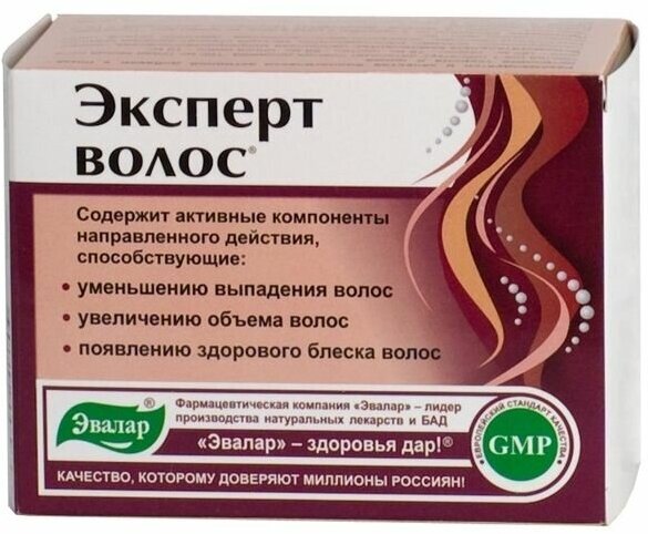 Эксперт волос - препарат, содержащий активные компоненты направленного действия для уменьшения выпадения волос и улучшения их состояния.Благодаря комплексному составу, «Эксперт волос» восполнит недостаток витаминов, микроэлементов и аминокислот, так необходимых для красоты и здоровья волос.Особенности продукта эксперт волос эвалар:уменьшает выпадение и стимулирует рост новых волос;улучшает питание волосяных луковиц, возвращая волосам жизненную силу и красоту;улучшают состояние кожи головы (без перхоти, зуда, раздражений);стимулирует образование коллагена в дерме, возвращая волосам блеск и сияние;источник натурального кремния (хвощ) в составе таблеток «Эксперт волос» повышает образование коллагена, необходимого для здоровья волос и кожи. Он питает волосы изнутри, придавая им блеск и здоровый вид; аминокислоты таурин и цистин обеспечивают необходимые условия для роста крепких и сильных волос, предупреждают их выпадение, обеспечивают им упругость, эластичность и здоровую текстуру. Цинк необходим для интенсивного роста и развития волос.Принимайте «Эксперт волос» и откройте для себя, насколько красивыми – густыми и блестящими – могут быть ваши волосы!Биологически активная добавка (БАД). Не является лекарственным средством. Товар соответствует требованиям ТР ТС 021/2011 и ТР ТС 022/2011. СоГР AM.01.07.01.003.R.000743.11.21 от 29.11.2021.Противопоказания:: индивидуальная непереносимость компонентов. Беременность. Кормление грудью.