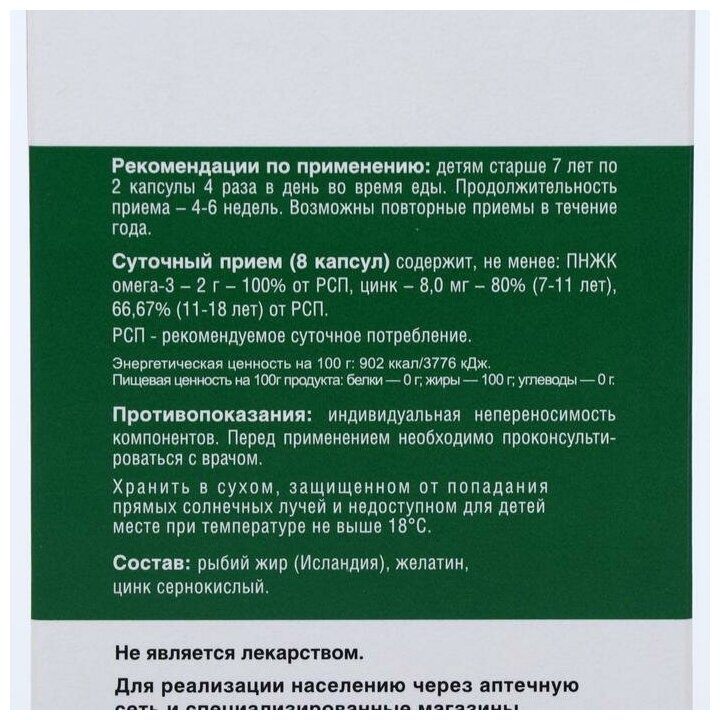 | Состав | рыбий жир (Исландия), цинк, желатин |