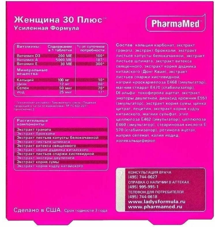 Комплекс Lady's formula Женщина 30 Плюс Усиленная формула произведен в США по международным фармацевтическим стандартам GMP, что гарантирует высокое качество и безопасность