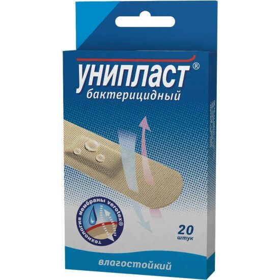 Бактерицидные влагостойкие лейкопластыри в современной упаковке в виде набора, в комплекте - 20 пластырей. Пластыри, входящие в состав набора, обладают следующими характеристиками: - основа - влагостойкая микроперфорированная пленка; - воздухопроницаемые; - атравматичные; - гипоаллергенные; - телесный цвет основы. Пленка с микроотверстиями в виде воронок обеспечивает свободный доступ воздуха и одновременно защищает от попадания влаги на поврежденный участок кожи.