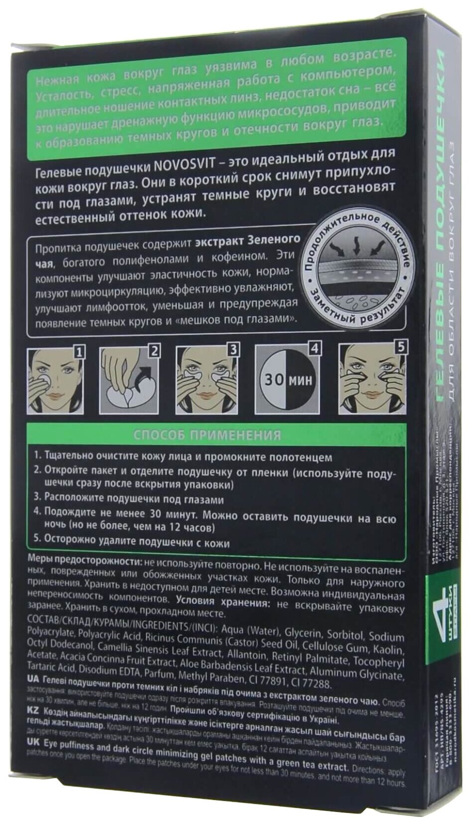 Против темных кругов и отеков под глазами. Восстанавливают естественный цвет кожи. Уменьшают припухлости без признаков усталости. Нежная кожа вокруг глаз уязвима в любом возрасте. Усталость, стресс, напряженная работа с компьютером, длительное ношение контактных линз, недостаток сна - все это разрушает дренажную функцию микрососудов, приводит к образованию темных кругов и отечности вокруг глаз. Гелевые подушечки Novosvit - это идеальный отдых для кожи вокруг глаз. Они в короткий срок снимут припухлости под глазами, устраняет темные круги и восстановят естественный оттенок кожи. Пропитка подушечек содержит экстракт Зеленого чая, богатого полифенолами и кофеином. Эти компоненты улучшают эластичность кожи, нормализуют микроциркуляцию, эффективно увлажняют, улучшают лимфоотток, уменьшая и предупреждая появление темных кругов и "мешков под глазами".