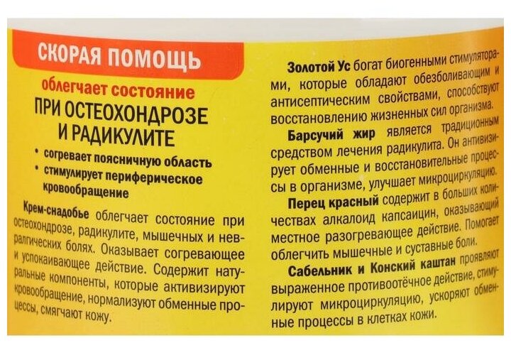 | Состав | вода, сок золотого уса, стеарин, кукурузное масло, моностеарат глицерина, вазелиновое масло, цетеариловый спирт, диметикон, медвежий жир, барсучий жир, масло облепихи, масло кедровое, экстракты красного перца, конского каштана, родиолы розовой, подорожника, зверобоя, сабельника, чабреца, токоферол-ацетат, камфора, триэтаноламин, метилпарабен, пропилпарабен |