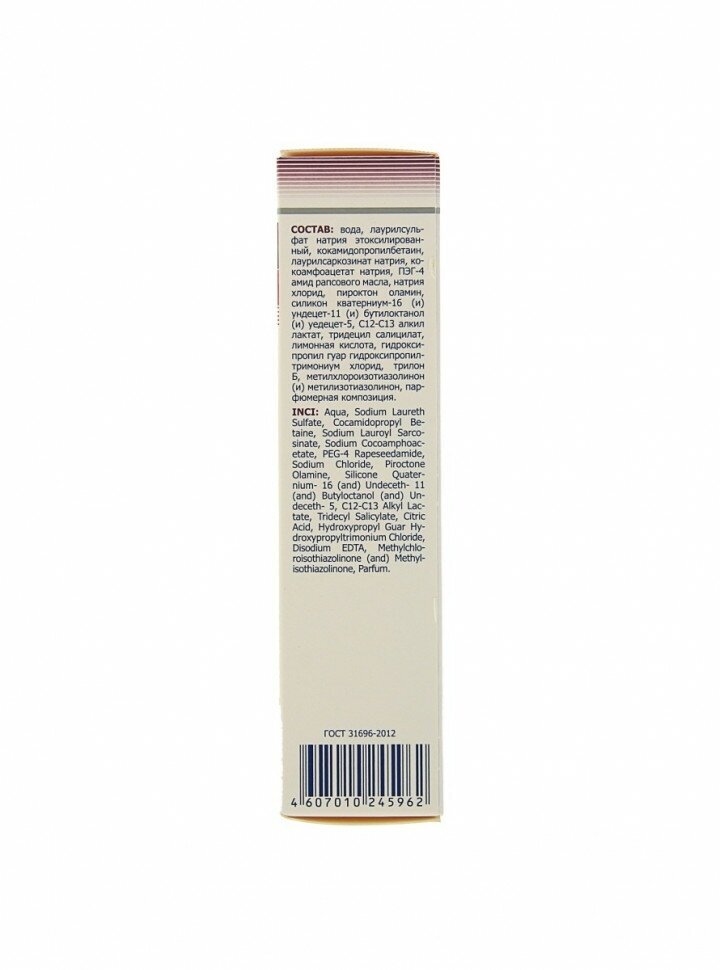 | Состав | вода; лаурилсульфат натрия этоксилированный; кокамидопропилбетаин; глицерин; диэтаноламид кокосового масла; кокоамфоацетат натрия; тетранил У (ундециленамидопропилтримониум метосульфат); поликватерниум-7; глицерет-7-кокоат; мальтоолигозил глюкозид-гидролизат гидрогенизированного крахмала; натрия хлорид; деготь березовый; гидроксипропил гуар гидроксипропилтримониум хлорид; лимонная кислота; катон CG; парфюмерная композиция |