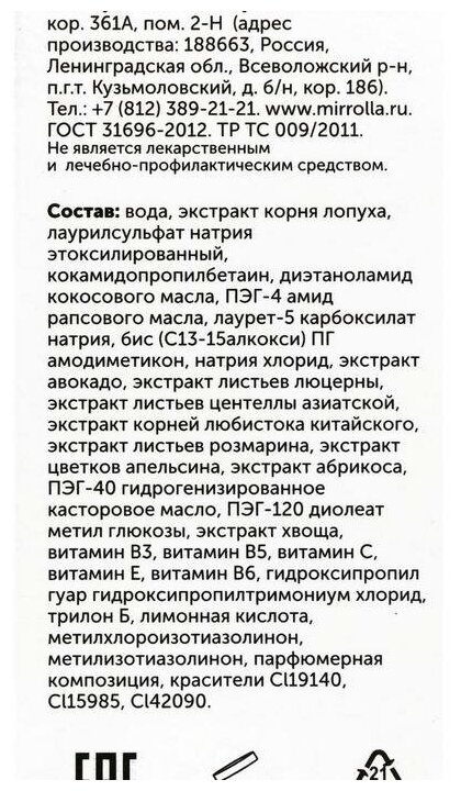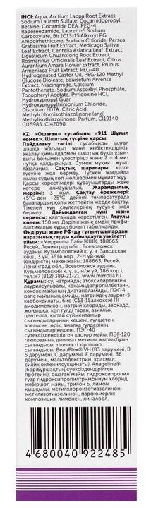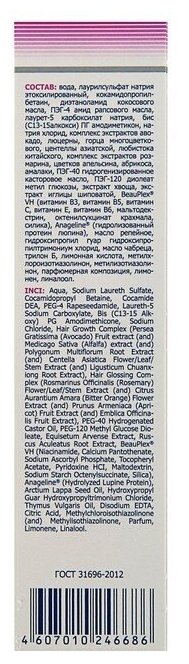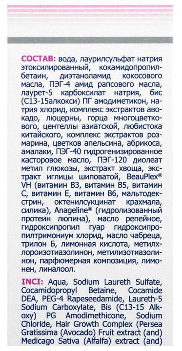| Состав | вода; лаурилсульфат натрия этоксилированный; кокамидо-пропилбетаин; диэтаноламид кокосового масла; ПЭГ-4 амид рапсового масла; лаурет-5 карбоксилат натрия; бис С13-15 алкокси ПГ амодиметикон; натрия хлорид; экстракт авокадо; экстракт люцерны; экстракт горца многоцветкового; экстракт центеллы азиатской; экстракт любистока китайского; экстракт розмарина; экстракт цветков апельсина; экстракт абрикоса; экстракт амалаки; ПЭГ-40 гидрогенизированное касторовое масло; ПЭГ-120 диолеат метил глюкозы; экстракт хвоща; экстракт иглицы шиповатой; BeauPlex VH витамин В3; витамин В5; витамин С; витамин Е; витамин В; мальтодекстрин; октенилсукцинат крахмала; силика; Anageline гидролизованный протеин люпина; масло репейное; гидроксипропил гуар гидроксипропилтримониум хлорид; масло чабреца; трилон Б; лимонная кислота; метилхлороизотиазолинон; метилизотиазолинон; парфюмерная композиция |
