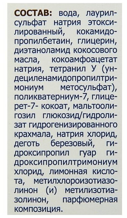 Состав: вода, лаурилсульфат натрия этоксилированный, кокамидопропилбетаин, глицерин, диэтаноламид кокосового масла, кокоамфоацетат натрия, тетранил У (ундециленамидопропилтримониум метосульфат), поликватерниум-7, глицерет-7- кокоат, мальтоолигозил глюкозид/гидролизат гидрогенизированного крахмала, натрия хлорид, деготь березовый, гидроксипропил гуар гидроксипропилтримониум хлорид, лимонная кислота, метилхлороизотиазолинон (и) метилизотиазолинон, парфюмерная композиция.