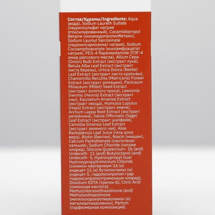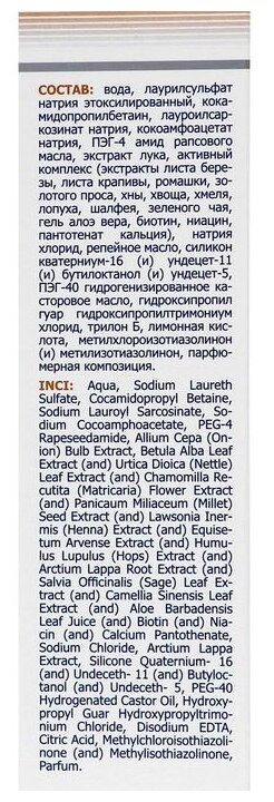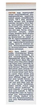 | Состав | вода; лаурилсульфат натрия этоксилированный; кокамидо-пропилбетаин; диэтаноламид кокосового масла; ПЭГ-4 амид рапсового масла; лаурет-5 карбоксилат натрия; бис С13-15 алкокси ПГ амодиметикон; натрия хлорид; экстракт авокадо; экстракт люцерны; экстракт горца многоцветкового; экстракт центеллы азиатской; экстракт любистока китайского; экстракт розмарина; экстракт цветков апельсина; экстракт абрикоса; экстракт амалаки; ПЭГ-40 гидрогенизированное касторовое масло; ПЭГ-120 диолеат метил глюкозы; экстракт хвоща; экстракт иглицы шиповатой; BeauPlex VH витамин В3; витамин В5; витамин С; витамин Е; витамин В; мальтодекстрин; октенилсукцинат крахмала; силика; Anageline гидролизованный протеин люпина; масло репейное; гидроксипропил гуар гидроксипропилтримониум хлорид; масло чабреца; трилон Б; лимонная кислота; метилхлороизотиазолинон; метилизотиазолинон; парфюмерная композиция |