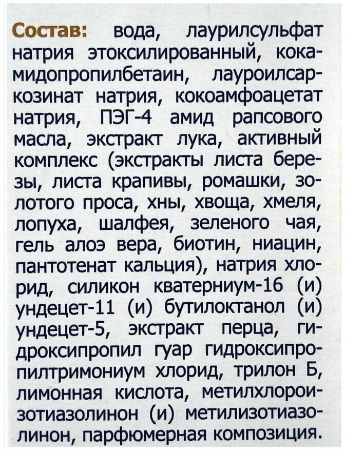 | Состав | вода; натрия лаурет сульфат; кокамидопропил бетаин; натрия лауроил саркозината; кокоамфоацетат натрия полиэтилен гликоль-4 рапсидамид; экстракт из луковицы; активный комплекс экстракт березовых листьев; экстракт крапивы; ромашка аптечная; экстракт цветков; экстракт семян просо; хна; экстракт хвоща; хмель обыкновенный; экстракт корня лопуха; экстракт листьев шалфея лекарственного; экстракт листьев чайного куста; сок листьев алоэ; биотон; ниацин; пантотенат кальция; хлорид натрия; силикон кватерниум -16а; гидроксипропилметилцеллюлоза гуаргидроксипропилтриаммонийхлорид; динатриевой соли ЭДТА; лимонная кислота; метилхлоризотиазолинон и метилизотиазолинон; парфюмерная отдушка |