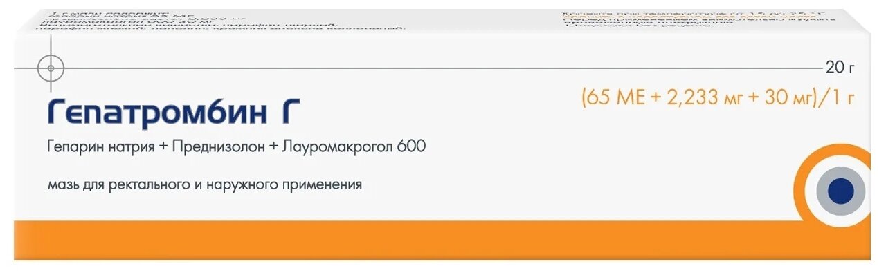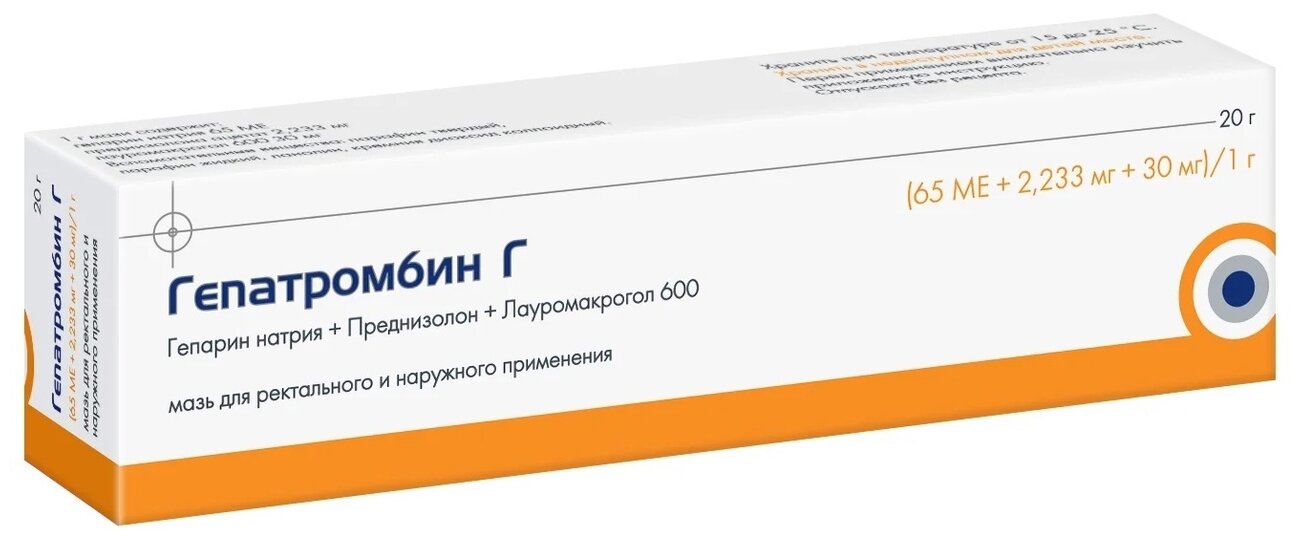 Показания наружный и внутренний геморрой; тромбофлебит вен заднего прохода; свищи, экзема и зуд в области ануса; трещины ануса. Фармакологическое действие Комбинированный препарат с антитромботическим, противовоспалительным и веносклерозирущим действием для местного применения в проктологии. Гепарин - антикоагулянт прямого действия. При наружном применении оказывает местное антитромботическое, противоэкссудативное и умеренное противовоспалительное действие; способствует регенерации соединительной ткани; предотвращает коагуляцию крови в геморроидальных узлах. Преднизолон - ГКС, оказывает противовоспалительное, противоэкссудативное и противоаллергическое действие, уменьшает зуд, чувство жжения, боль в аноректальной области. Лауромакрогол 400 (полидоканол) оказывает местноанестезирующее действие и обеспечивает склерозирование геморроидальных узлов. Лекарственное взаимодействие Данные о лекарственном взаимодействии препарата Гепатромбин Г не предоставлены.