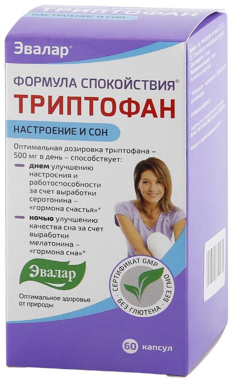 «Формула спокойствия Триптофан» днем поможет в любой ситуации сохранять спокойствие и безмятежность, а ночью – легко заснуть и полноценно выспаться. В ее составе – комплекс L-триптофана и витаминов группы В, необходимый для синтеза «гормона счастья» - серотонина, из которого в темное время суток вырабатывается «гормон сна» - мелатонин. «Формула спокойствия Триптофан», способствуя синтезу в организме серотонина и мелатонина, действует универсально. Днем:создает ощущение приподнятого настроения, эмоционального и душевного комфорта;повышает уровень работоспособности, стимулирует познавательную активность (в том числе в стрессовых ситуациях);способствует сохранению эмоциональной устойчивости (самообладанию) в условиях повышенных умственных и эмоциональных нагрузок;снижает раздражительность, агрессивность (в том числе – на фоне диет, отказа от курения и алкоголя);устраняет чувство тревоги, страха, эмоционального напряжения. Ночью:помогает легко и быстро заснуть;улучшает глубину и качество сна;устраняет проблему прерывистого сна;позволяет полноценно выспаться и отдохнуть за более короткое время. «Формула спокойствия Триптофан» поможет восстановить сбившуюся «настройку» Вашего организма наиболее естественным образом. С каждым новым днем к Вам будет возвращаться хорошее настроение, жизнерадостность и уверенность в себе. Прием двух капсул в день обеспечивает адекватный уровень суточного потребления L-триптофана (500 мг) на 62,5%, витамина B5(5мг) на 83%, витамина B6(2мг) на 100%.