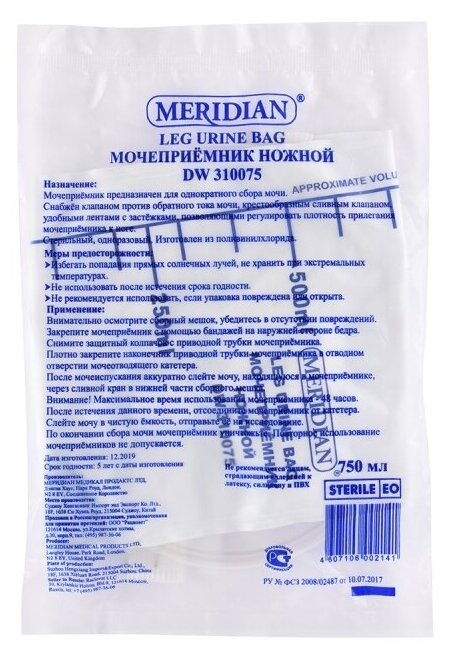 Медицинская продукция марки MERIDIAN® представлена на российском рынке с 2005 года и успешно зарекомендовала себя среди поставщиков и потребителей данной продукции.МОЧЕПРИЕМНИК МАРКИ МЕРИДИАН НОЖНОЙ DW310075 - изделие медицинского назначения.Характеристика: