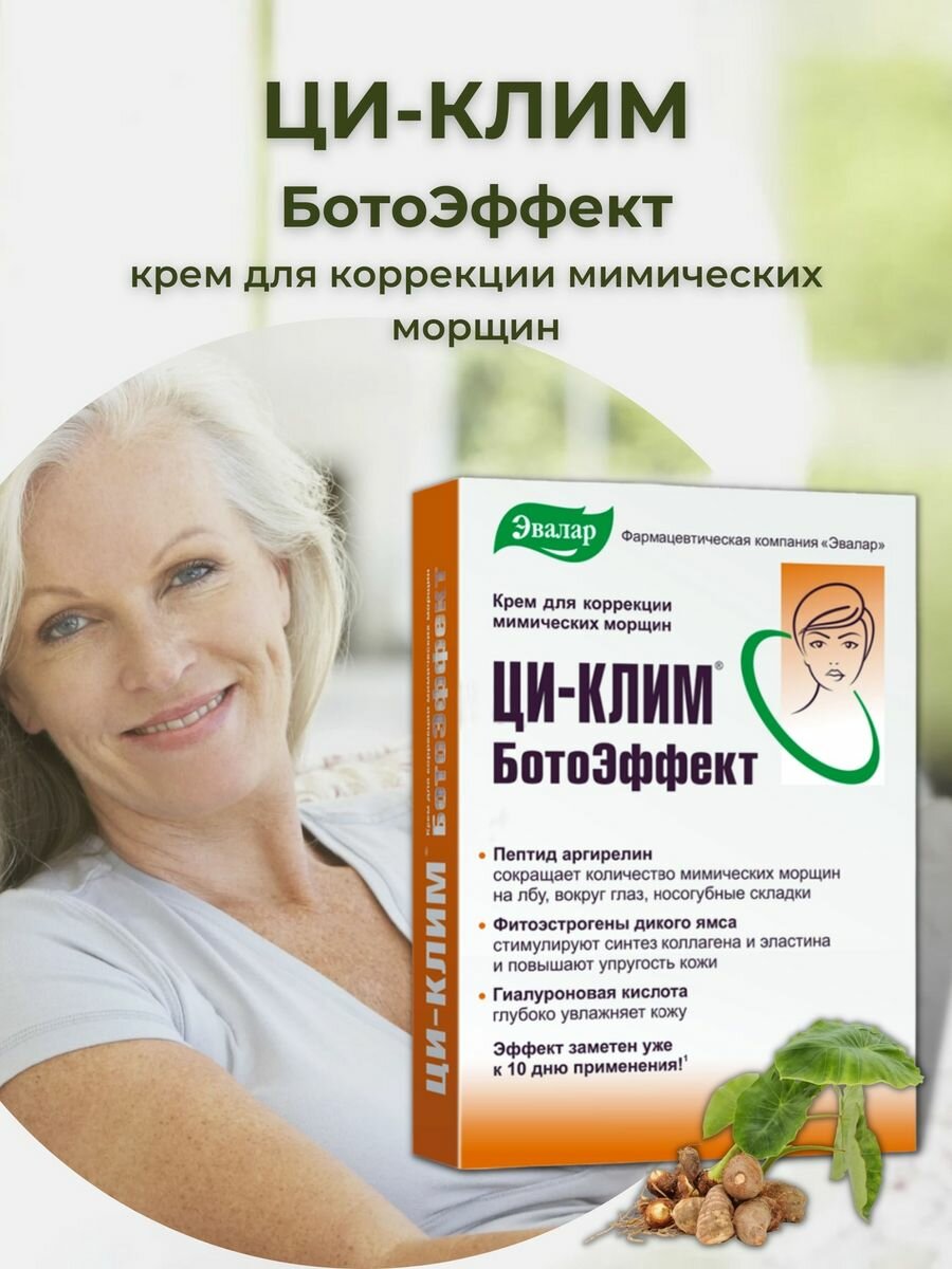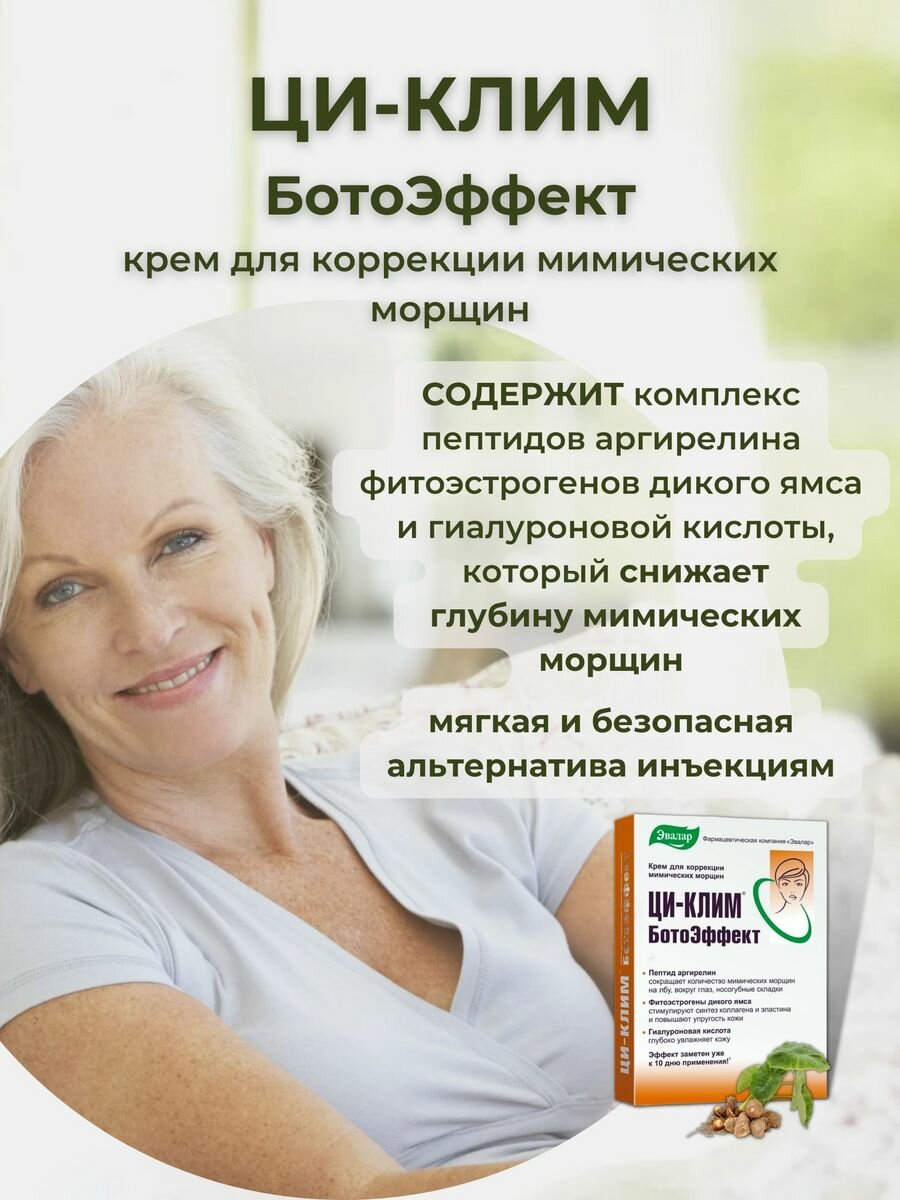 Каждый день мы выражаем свои эмоции: плачем, смеемся, злимся или беспокоимся о чем-либо И каждый день наши эмоции оставляют все более заметные следы на нашем лице: мимические морщины.Если вы не готовы мириться с появлением мимических морщин и не сторонник контурной пластики (инъекции ботокс, диспорт, препараты для заполнения морщин и т.д.) или хотите продлить эстетический эффект, полученный от инъекционных препаратов, то крем «Ци-клим Botoeffect» - это крем для вас.Крем «Ци-клим Botoeffect» содержит инновационную молекулу - пептид аргилерин который:— широко используется в профессиональной косметике, являясь более безопасной и мягкой альтернативой инъекционной коррекции мимических морщин:— снижает глубину мимических морщин, особенно на лбу и вокруг глаз уже к 10 дню применения:— при регулярном применении препятствует формированию мимических морщин, не превращая лицо в безжизненную маску.* Новая косметология. Том 1. А.А. Марголина, Е.И.Эрнандест. М.: ООО «Фирма КЛАВЕЛЬ», 2005. – 424 с.: ил.Используйте также крем «Ци-клим» для лица, который стимулирует обновление клеток эпидермиса, увеличивает выработку коллагена и эластина, восстанавливает упругость и эластичность кожи. А для женщин после 40 и в климактерическом периоде таблетки «Ци-клим» содержащие фитоэстрогены цимицифуги – растительный аналог женских половых гормонов.для коррекции мимических морщин