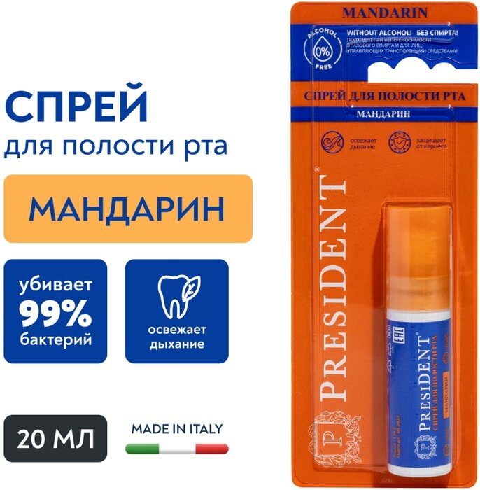 Спрей PRESIDENT Mandarin без спирта. Спрей для полости рта со вкусом мандарина убивает бактерии, освежает и способствует здоровому дыханию. Ксилитол защищает от кариеса. Спрей подходит при непереносимости этилового спирта и для лиц, управляющих транспортными средствами.