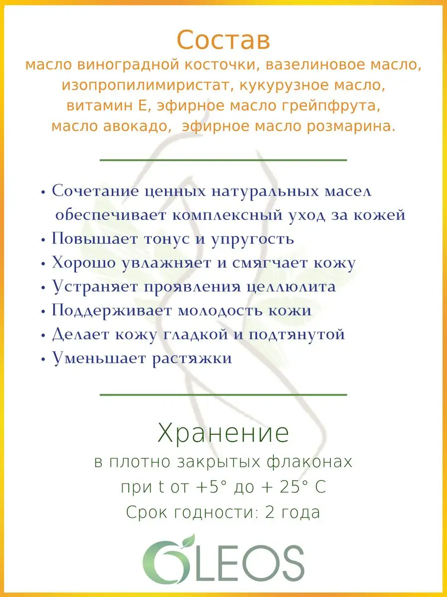 Масло для тела Oleos Упругость кожи обеспечивает комплексный уход за кожей. Обладает регенерирующими и омолаживающими свойствами, восстанавливает и подтягивает кожу. Способствует хорошему увлажнению и смягчению кожи.