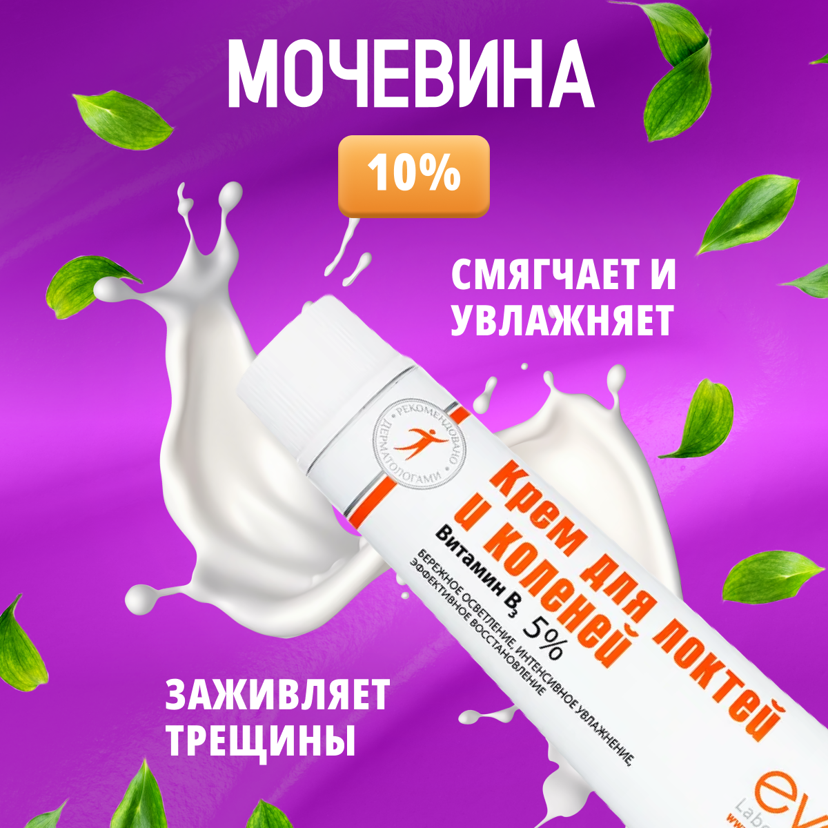 Кожа на локтях и коленях, особенно с возрастом, склонна к гиперкератозу (сухости, шелушению, огрубению), что приводит к ее гиперпигментации (локальному потемнению). Это доставляет дискомфорт: выглядит неэстетично и негативно влияет на качество нашей жизни.Оптимальная концентрация Витамина В3 (5%) в составе продукта поможет оперативно восстановить здоровый цвет кожи и защитить ее от негативного внешнего воздействия.Для усиления смягчающего свойства крема в состав введен карбамид (мочевина). Высокое содержание карбамида (10%) интенсивно смягчает и увлажняет сухую, огрубевшую и потрескавшуюся кожу, способствует ее обновлению.Уже через 7 дней регулярного применения кожа на локтях и коленях заметно улучшается, а через месяц полностью восстанавливается и радует вас здоровым внешним видом.Состав: Состав: вода, карбамид, каприлик/каприк триглицерид, глицерин, сорбитол, ниацинамид, стеарин, воск эмульсионный, диметикон, цетеариловый спирт, изопропилпальмитат, циклометикон, триэтаноламин, дипропиленгликоль (и) каприлилгликоль (и) метилизотиазолинон, ароматическая композиция, бисаболол, динатрий ЭДТА, аллантоин, тетрадибутил пентаэритритилгидроксигидроциннамат, карбомер, кислота молочная, ПЭГ-7М.