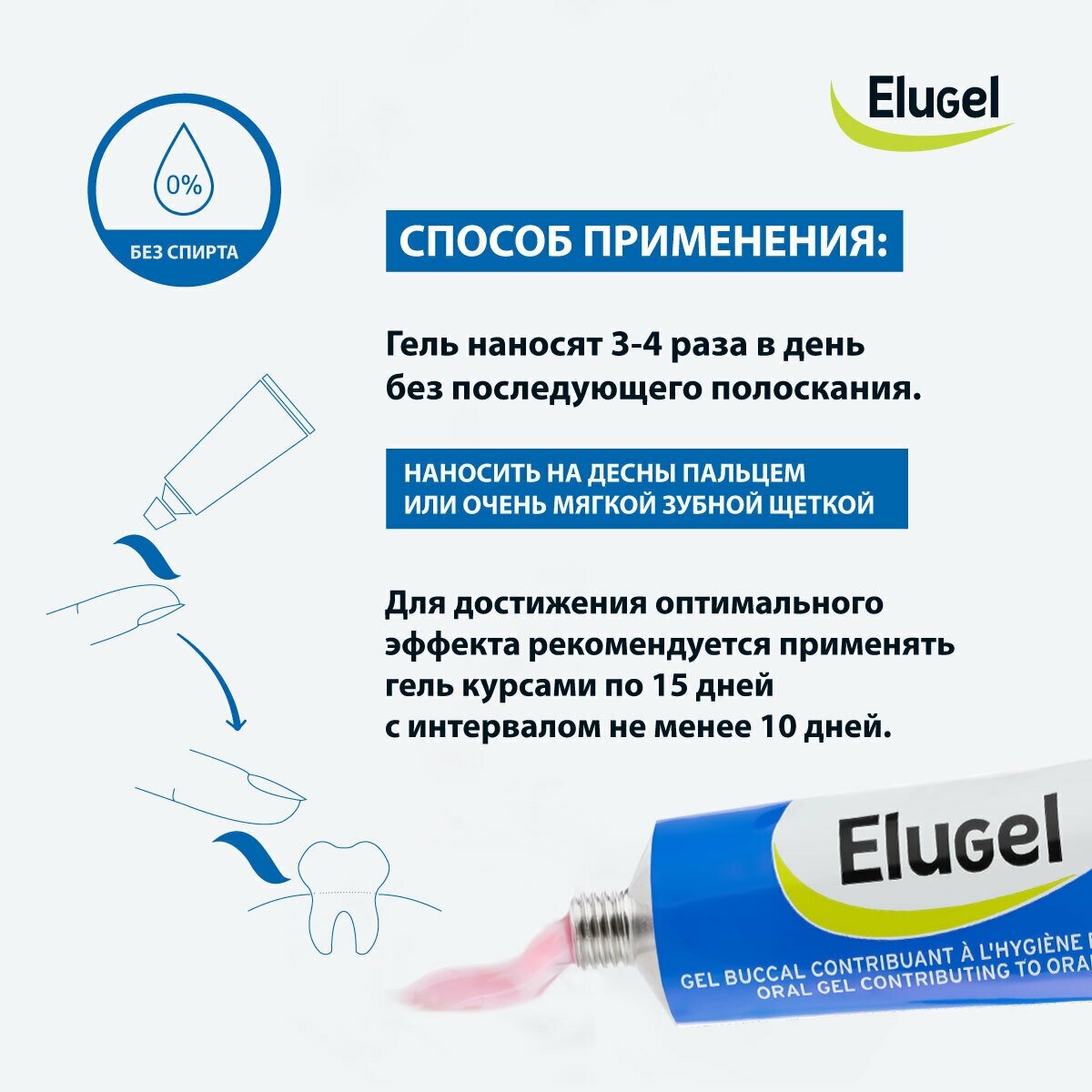 Гель наносят на десны пальцем или очень мягкой зубной щеткой. Для достижения оптимального эффекта использовать гель Элюгель курсами по 15 дней с интервалами не менее 10-и дней. Содержание хлоргексидина — 0,2%.