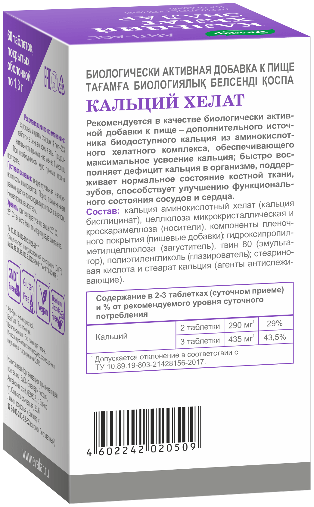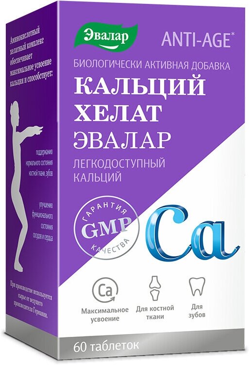 Аминокислотный хелатный комплекс для максимального усвоения кальция Кальций хелат Эвалар:Обеспечивает максимальное усвоение кальция;Быстро восполняет дефицит кальция в организме; Поддерживает нормальное состояние костной ткани, зубов; Способствует улучшению функционального состояния сосудов и сердца. Преимущества хелатной формы кальцияОбладает высокой биодоступностью – способна усваиваться на 90-98%;Не влияет на уровень желудочной кислотности;Не вызывает вздутия и нарушения пищеварения;При приеме не происходит отложение нерастворимых осадков на стенках кровеносных сосудов, которое может вызывать развитие кальциноза и привести к хрупкости сосудов и суставов.Способна проникать через барьер плаценты беременных и питать развивающийся плод.