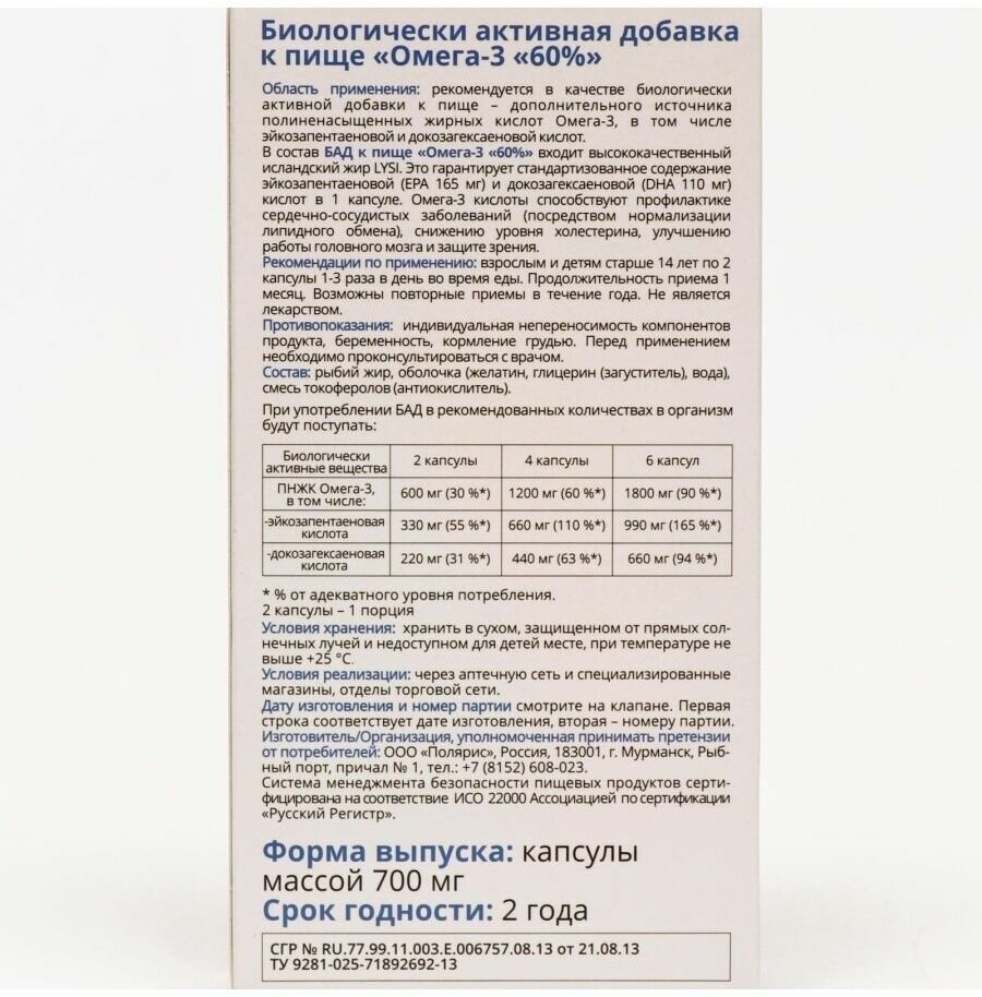 Биологически активная добавка Омега-3 60% содержит стандартизованное количество эйкозапентаеновой (EPA 165 мг) и докозагексаеновой кислот (DHA 110 мг) в 1 капсуле. В производстве используется высококачественный исландский жир LYSI, прошедший процесс дополнительной концентрации Омега-3 кислот до 60%. Несколько этапов очистки сырья гарантирует отсутствие пестицидов и холестерина. Продукт обладает нейтральным запахом и не имеет привкуса. Полиненасыщенные жирные кислоты Омега-3 являются важным компонентом сбалансированного питания. Для обеспечения хорошего самочувствия важно поддерживать необходимый уровень потребления жирных кислот, так как DHA и EPA эффективно накапливаются именно при поступлении в организм с пищей и биологически активными добавками. Содержание Омега3 - 600мг (в 2 капсулах)