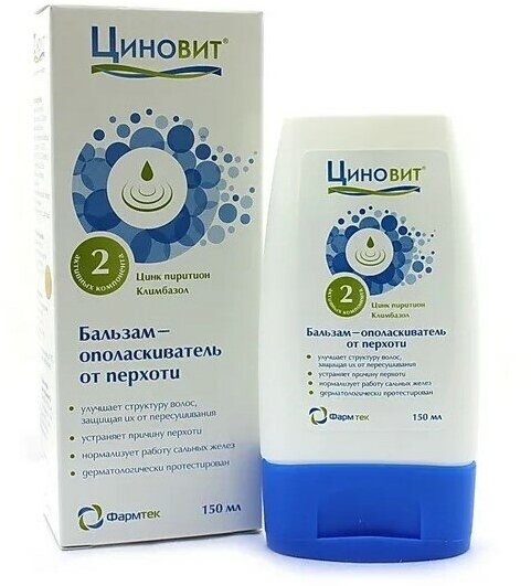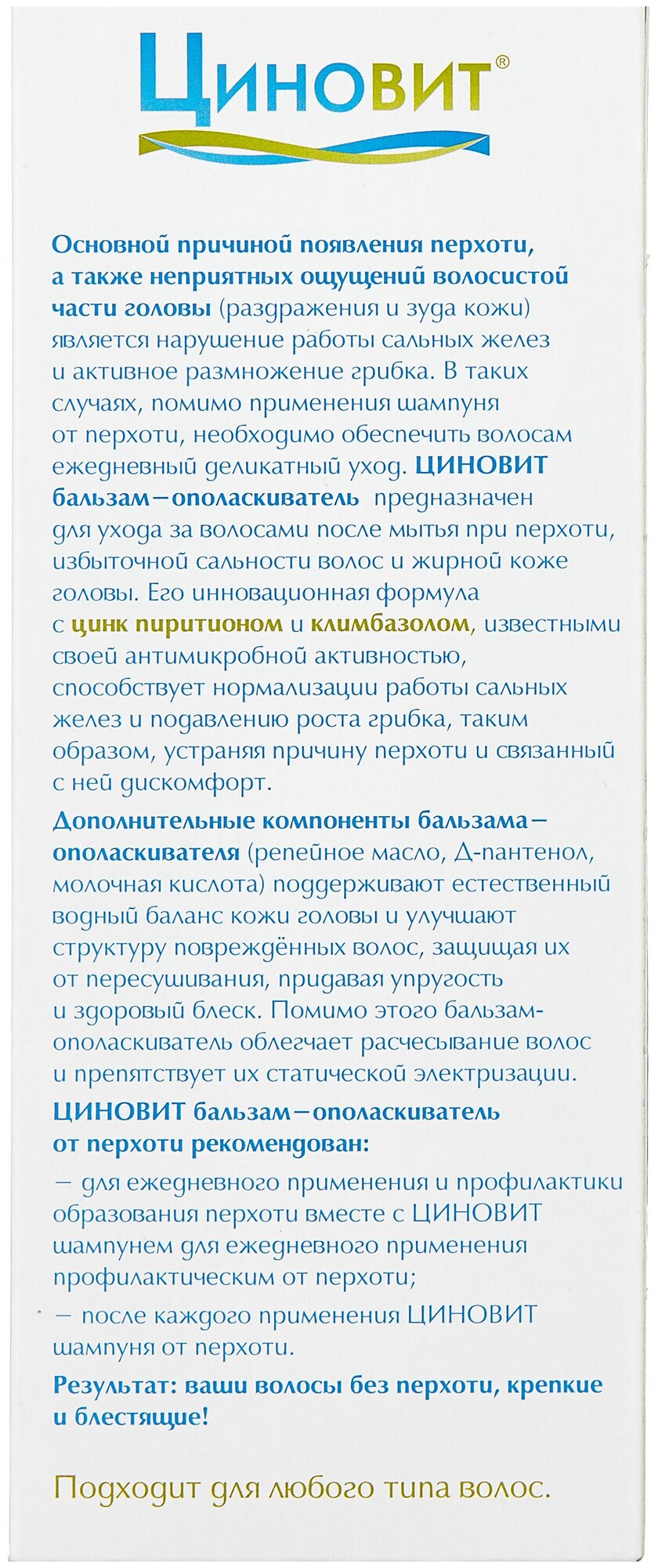 • Протестирован дерматологами Активные компоненты и область применения: Инновационная формула ЦИНОВИТ бальзама-ополаскивателя с цинк пиритионом и климбазолом, известными своей антимикробной активностью способствует нормализации работы сальных желез и подавлению роста грибка, таким образом, устраняя причину перхоти и связанные с ней раздражение и зуд. Дополнительные компоненты бальзама-ополаскивателя (репейное масло, Д-пантенол, молочная кислота) восстанавливают естественный водный баланс кожи головы и улучшают структуру повреждённых волос, защищая их от пересушивания, придавая упругость и здоровый блеск. Помимо этого бальзам-ополаскиватель облегчает расчесывание волос и препятствует их статической электризации. ЦИНОВИТ бальзам-ополаскиватель от перхоти рекомендован: - для ежедневного применения и профилактики образования перхоти вместе с ЦИНОВИТ шампунем для ежедневного применения профилактическим от перхоти; - после каждого применения ЦИНОВИТ шампуня от перхоти. Результат: ваши волосы без перхоти, крепкие и блестящие! Подходит для любого типа волос.