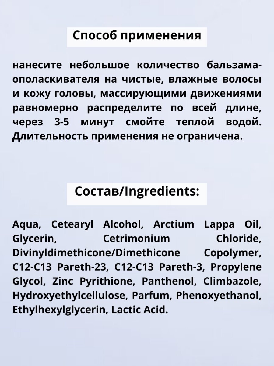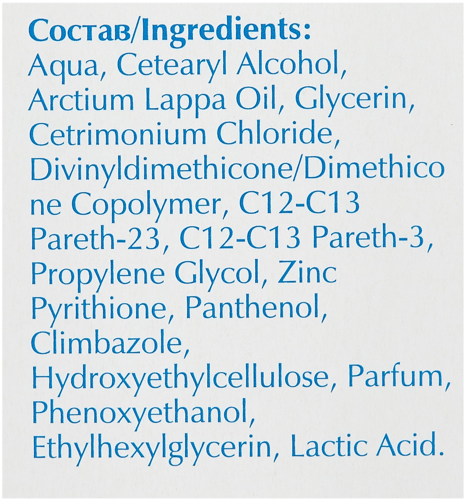 | Состав | Aqua; Cetearyl Alcohol; Arctium Lappa Oil; Glycerin; Cetrimonium Chloride; Divinyldimethicone/Dimethicone Copolymer; C12-C13 Pareth-23; C12-C13 Pareth-3; Propylene Glycol; Zinc Pyrithione; Panthenol; Climbazole; Hydroxyethylcellulose; Parfum; Phenoxyethanol; Ethylhexylglycerin; Lactic Acid |