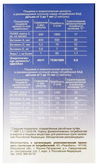 | Состав | рыбий жир, оболочка капсулы (желатин, глицерин (влагоудерживающий агент), вода, микрокристаллическая целлюлоза (антислеживающий агент), натуральный ароматизатор Тутти-Фрутти, декстроза, лимонная кислота (регулятор кислотности)), витамин E, витамин A, витамин D |