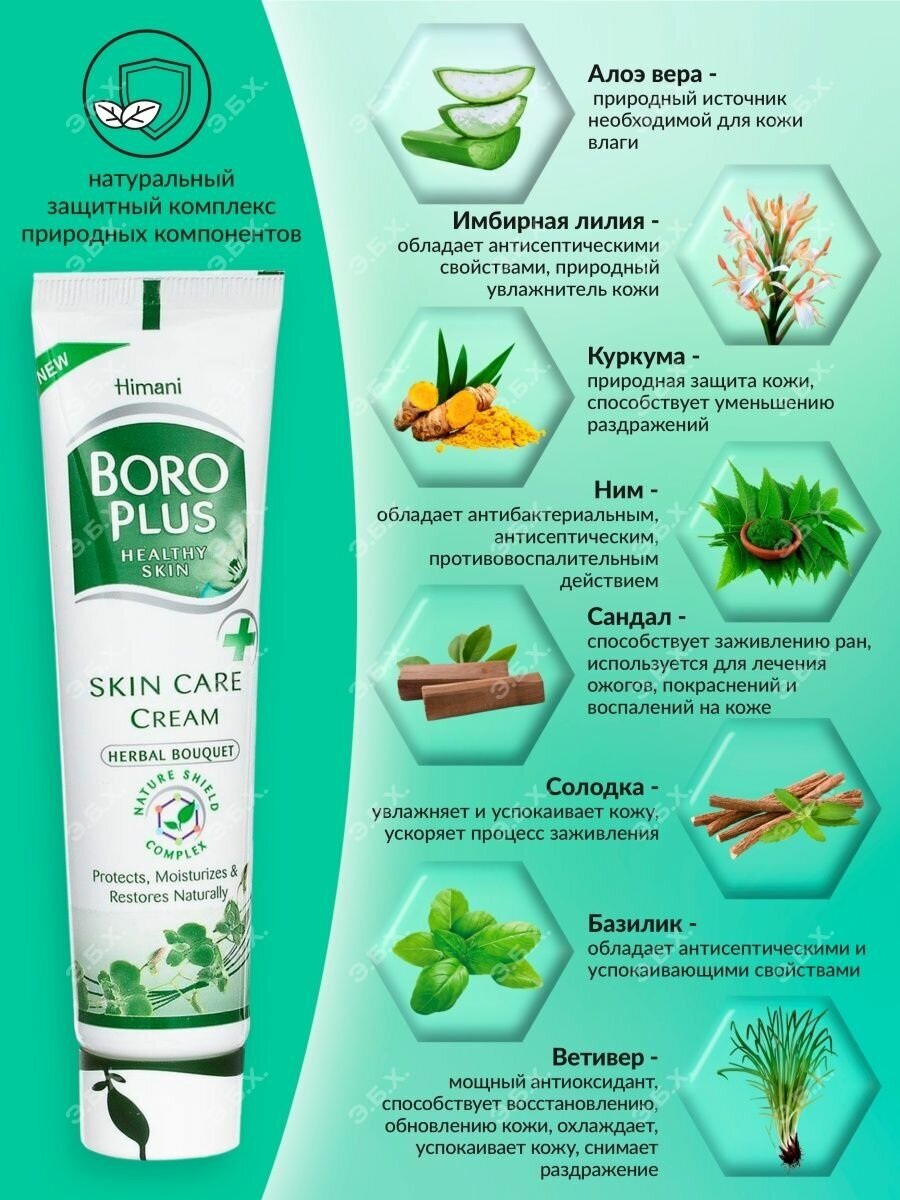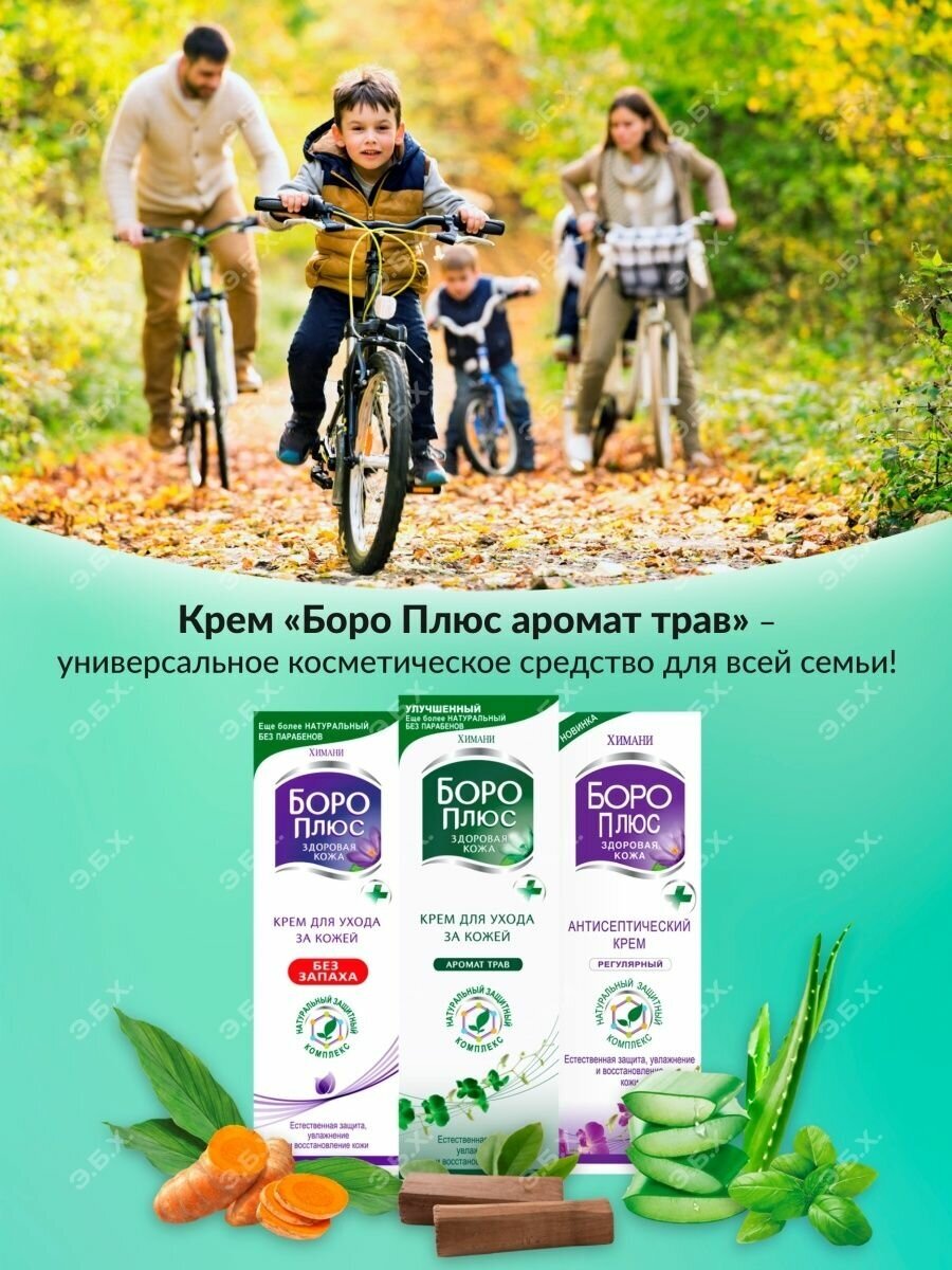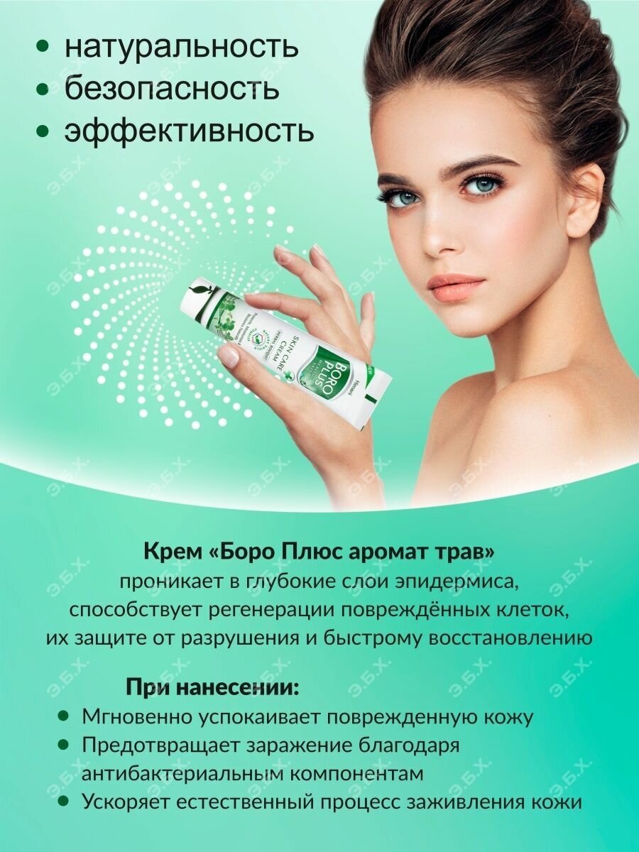 БОРО ПЛЮС - это универсальное средство для ухода и защиты кожи для всей семьи! Благодаря уникальному комплексу трав, известных своими лечебными свойствами, БОРО ПЛЮС защищает кожу и способствует быстрому заживлению небольших ран, порезов, бытовых и солнечных ожогов, ссадин, царапин и других повреждений кожи. Снимает зуд и неприятные ощущения от укусов насекомых. Ингредиенты крема обладают противовоспалительными, антисептическими и усиленными восстанавливающими свойствами. Ухаживает за кожей, защищая ее от вредных факторов окружающей среды. БОРО ПЛЮС - ОДИН КРЕМ ОТ МНОЖЕСТВА ПРОБЛЕМ! Крем АРОМАТ ТРАВ - обладает легким ароматом природных целебных трав.