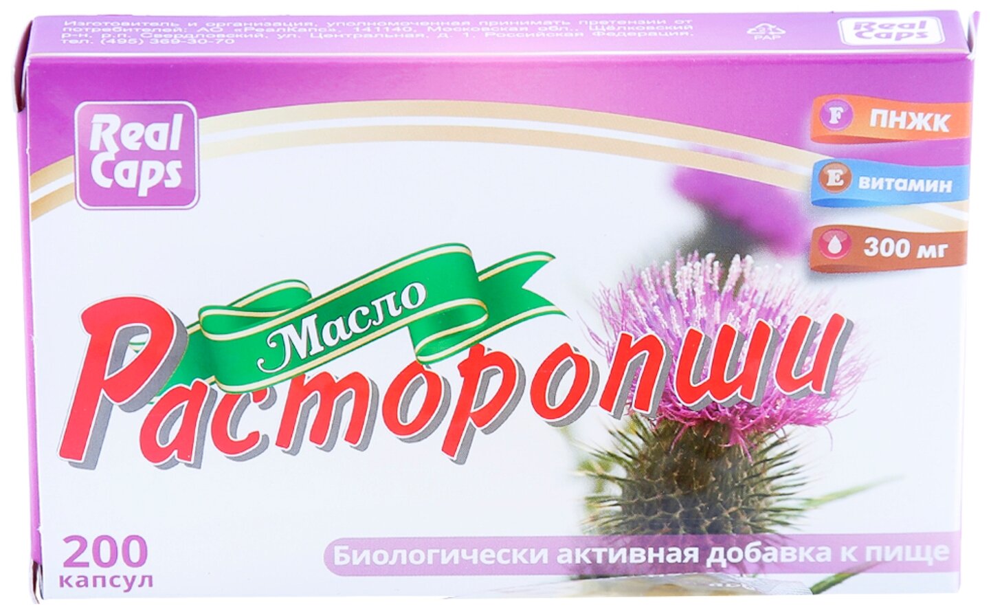 Расторопша - мощное растение с крупными пурпурно-красными соцветиями из семейства Астровых. От других "родственников" ее отличает "мраморный" узор на листьях, похожий на упавшие на них капли молока.Молочный чертополох (расторопша) тысячелетиями использовался для лечения печени. Он содержит натуральное вещество силимарин - это смесь гликозидов (силибин, силидианин, силихристин), которая, прежде всего, помогает печени осуществлять детоксикационную функцию, в том числе за счет повышения уровня антиоксидантной защиты.Масло богато жирорастворимыми витаминами A, D, E, F, особенно много в нем витамина Е, главного антиоксиданта среди витаминов. Он активно участвует в нейтрализации свободных радикалов, которые "ломают" многие ферментативные реакции, нанося непоправимый вред организму.Хорошие результаты показывает использование масла расторопши для восстановления организма при алкогольных отравлениях, болезнях кишечника и язве желудка.Масло расторопши незаменимо:в процессе отвыкания от алкоголя и наркотиков;для устранения побочных эффектов при приеме лекарств, действующих на печень;после прохождения курса химио- или лучевой терапии;в процессе выздоровления после лечения заболеваний печени;в гомеопатии при заболеваниях печени, желчного пузыря, селезенки.Масло расторопши оказывает выраженное заживляющее, болеутоляющее, желчегонное действие.Показания: : Рекомендуется в качестве биологически активной добавки к пище — дополнительного источника полиненасыщенных жирных кислот (ПНЖК).Способ применения: Взрослым и детям старше 14 лет по 1 капсулы массой 1360 мг 1-2 раза в день во время еды.Продолжительность приема – 4-6 недель. При необходимости приём можно повторить.Противопоказания: индивидуальная непереносимость компонентов. Перед применением рекомендуется проконсультироваться с врачом. Не является лекарством.Состав: Масло из плодов расторопши пятнистой, оболочка капсулы (желатин, глицерин (влагоудерживающий агент), вода деминерализованная), этилванилин.